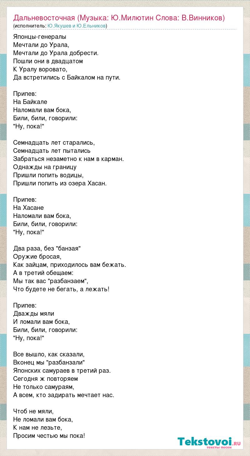 Японцы-генералы Мечтали до Урала, Мечтали до Урала добрести. Пошли они в двадцатом К Уралу воровато, Да встретились с Байкалом на пути. Припев: На Байкале Наломали вам бока, Били, били, говорили: "Ну, пока!" Семнадцать лет старались, Семнадцать лет пытались Забраться незаметно к нам в карман. Однажды на границу Пришли попить водицы, Пришли попить из озера Хасан. Припев: На Хасане Наломали вам бока, Били, били, говорили: "Ну, пока!" Два раза, без "банзая" Оружие бросая, Как зайцам, приходилось вам бежать. А в третий обещаем: Мы так вас "разбанзаем", Что будете не бегать, а лежать! Припев: Дважды мяли И ломали вам бока, Били, били, говорили: "Ну, пока!" Все вышло, как сказали, Вконец мы "разбанзали" Японских самураев в третий раз. Сегодня ж повторяем Не только самураям, А всем, кто задирать мечтает нас. Чтоб не мяли, Не ломали вам бока, К нам не лезьте, Просим честью мы пока!