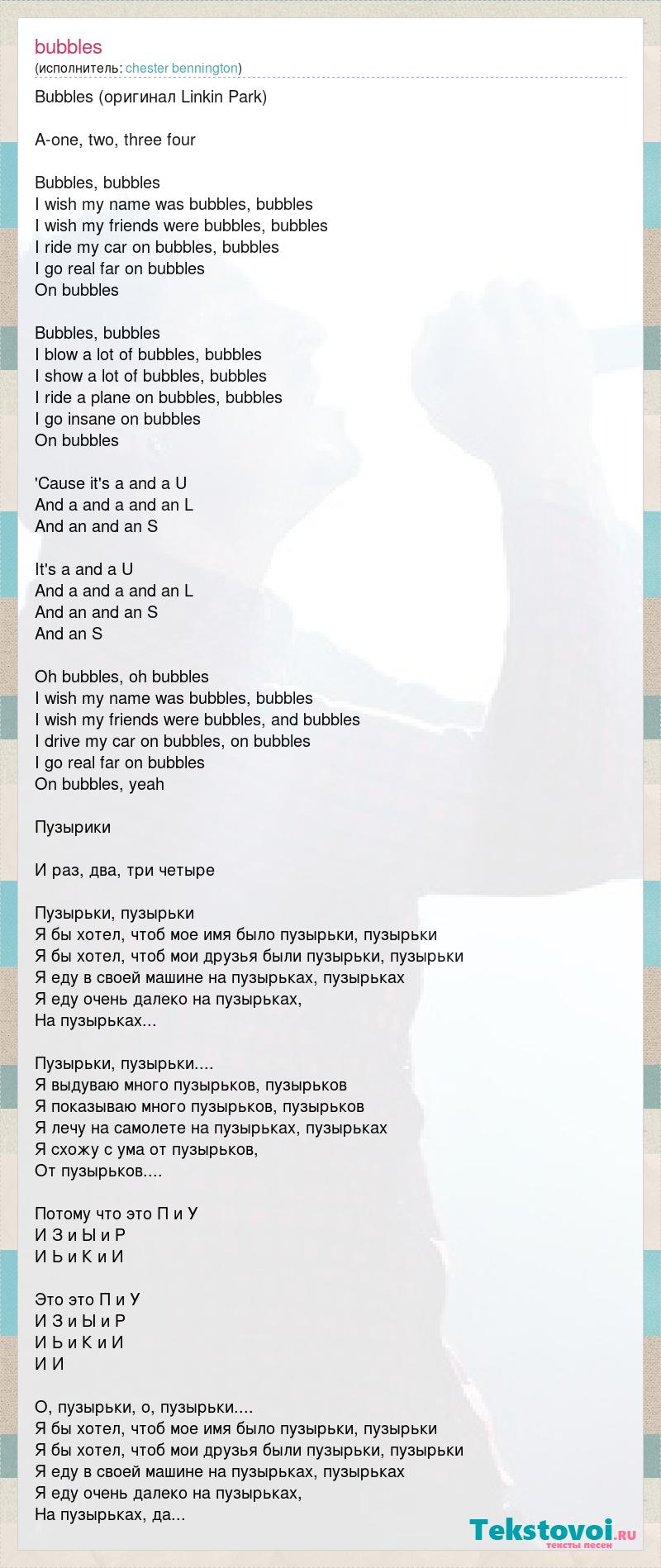 Bubbles (оригинал Linkin Park) A-one, two, three four Bubbles, bubbles I wish my name was bubbles, bubbles I wish my friends were bubbles, bubbles I ride my car on bubbles, bubbles I go real far on bubbles On bubbles Bubbles, bubbles I blow a lot of bubbles, bubbles I show a lot of bubbles, bubbles I ride a plane on bubbles, bubbles I go insane on bubbles On bubbles 'Cause it's a and a U And a and a and an L And an and an S It's a and a U And a and a and an L And an and an S And an S Oh bubbles, oh bubbles I wish my name was bubbles, bubbles I wish my friends were bubbles, and bubbles I drive my car on bubbles, on bubbles I go real far on bubbles On bubbles, yeah Пузырики И раз, два, три четыре Пузырьки, пузырьки Я бы хотел, чтоб мое имя было пузырьки, пузырьки Я бы хотел, чтоб мои друзья были пузырьки, пузырьки Я еду в своей машине на пузырьках, пузырьках Я еду очень далеко на пузырьках, На пузырьках... Пузырьки, пузырьки.... Я выдуваю много пузырьков, пузырьков Я показываю много пузырьков, пузырьков Я лечу на самолете на пузырьках, пузырьках Я схожу с ума от пузырьков, От пузырьков.... Потому что это П и У И З и Ы и Р И Ь и К и И Это это П и У И З и Ы и Р И Ь и К и И И И О, пузырьки, о, пузырьки.... Я бы хотел, чтоб мое имя было пузырьки, пузырьки Я бы хотел, чтоб мои друзья были пузырьки, пузырьки Я еду в своей машине на пузырьках, пузырьках Я еду очень далеко на пузырьках, На пузырьках, да...