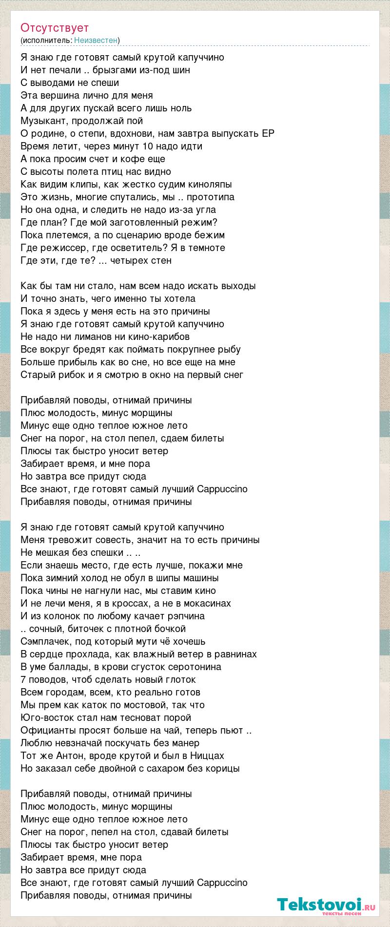 Я знаю где готовят самый крутой капуччино И нет печали .. брызгами из-под шин С выводами не спеши Эта вершина лично для меня А для других пускай всего лишь ноль Музыкант, продолжай пой О родине, о степи, вдохнови, нам завтра выпускать EP Время летит, через минут 10 надо идти А пока просим счет и кофе еще С высоты полета птиц нас видно Как видим клипы, как жестко судим киноляпы Это жизнь, многие спутались, мы .. прототипа Но она одна, и следить не надо из-за угла Где план? Где мой заготовленный режим? Пока плетемся, а по сценарию вроде бежим Где режиссер, где осветитель? Я в темноте Где эти, где те? ... четырех стен Как бы там ни стало, нам всем надо искать выходы И точно знать, чего именно ты хотела Пока я здесь у меня есть на это причины Я знаю где готовят самый крутой капуччино Не надо ни лиманов ни кино-карибов Все вокруг бредят как поймать покрупнее рыбу Больше прибыль как во сне, но все еще на мне Старый рибок и я смотрю в окно на первый снег Прибавляй поводы, отнимай причины Плюс молодость, минус морщины Минус еще одно теплое южное лето Снег на порог, на стол пепел, сдаем билеты Плюсы так быстро уносит ветер Забирает время, и мне пора Но завтра все придут сюда Все знают, где готовят самый лучший Сappuccino Прибавляя поводы, отнимая причины Я знаю где готовят самый крутой капуччино Меня тревожит совесть, значит на то есть причины Не мешкая без спешки .. .. Если знаешь место, где есть лучше, покажи мне Пока зимний холод не обул в шипы машины Пока чины не нагнули нас, мы ставим кино И не лечи меня, я в кроссах, а не в мокасинах И из колонок по любому качает рэпчина .. сочный, биточек с плотной бочкой Сэмплачек, под который мути чё хочешь В сердце прохлада, как влажный ветер в равнинах В уме баллады, в крови сгусток серотонина 7 поводов, чтоб сделать новый глоток Всем городам, всем, кто реально готов Мы прем как каток по мостовой, так что Юго-восток стал нам тесноват порой Официанты просят больше на чай, теперь пьют .. Люблю невзначай поскучать без манер Тот же Антон, вроде крутой и был в Ниццах Но заказал себе двойной с сахаром без корицы Прибавляй поводы, отнимай причины Плюс молодость, минус морщины Минус еще одно теплое южное лето Снег на порог, пепел на стол, сдавай билеты Плюсы так быстро уносит ветер Забирает время, мне пора Но завтра все придут сюда Все знают, где готовят самый лучший Сappuccino Прибавляя поводы, отнимая причины