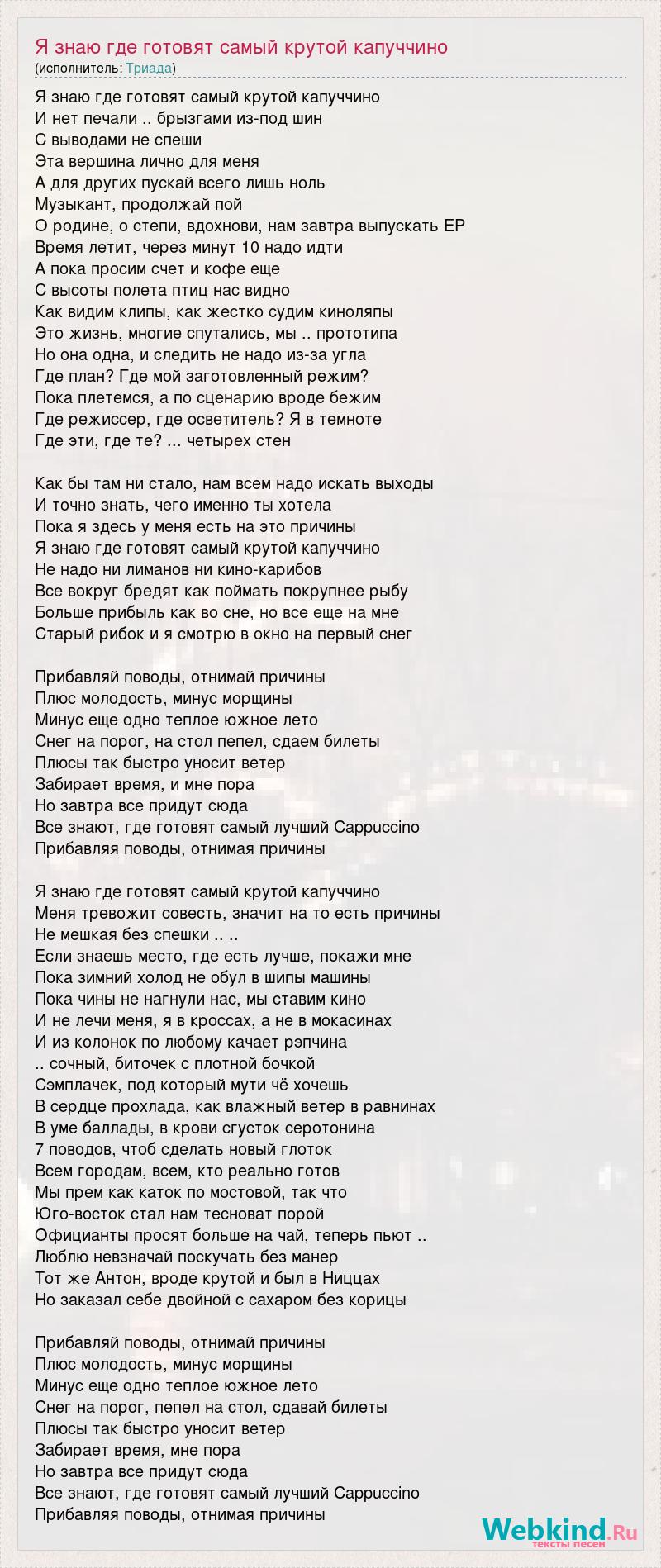 Я знаю где готовят самый крутой капуччино И нет печали .. брызгами из-под шин С выводами не спеши Эта вершина лично для меня А для других пускай всего лишь ноль Музыкант, продолжай пой О родине, о степи, вдохнови, нам завтра выпускать EP Время летит, через минут 10 надо идти А пока просим счет и кофе еще С высоты полета птиц нас видно Как видим клипы, как жестко судим киноляпы Это жизнь, многие спутались, мы .. прототипа Но она одна, и следить не надо из-за угла Где план? Где мой заготовленный режим? Пока плетемся, а по сценарию вроде бежим Где режиссер, где осветитель? Я в темноте Где эти, где те? ... четырех стен Как бы там ни стало, нам всем надо искать выходы И точно знать, чего именно ты хотела Пока я здесь у меня есть на это причины Я знаю где готовят самый крутой капуччино Не надо ни лиманов ни кино-карибов Все вокруг бредят как поймать покрупнее рыбу Больше прибыль как во сне, но все еще на мне Старый рибок и я смотрю в окно на первый снег Прибавляй поводы, отнимай причины Плюс молодость, минус морщины Минус еще одно теплое южное лето Снег на порог, на стол пепел, сдаем билеты Плюсы так быстро уносит ветер Забирает время, и мне пора Но завтра все придут сюда Все знают, где готовят самый лучший Сappuccino Прибавляя поводы, отнимая причины Я знаю где готовят самый крутой капуччино Меня тревожит совесть, значит на то есть причины Не мешкая без спешки .. .. Если знаешь место, где есть лучше, покажи мне Пока зимний холод не обул в шипы машины Пока чины не нагнули нас, мы ставим кино И не лечи меня, я в кроссах, а не в мокасинах И из колонок по любому качает рэпчина .. сочный, биточек с плотной бочкой Сэмплачек, под который мути чё хочешь В сердце прохлада, как влажный ветер в равнинах В уме баллады, в крови сгусток серотонина 7 поводов, чтоб сделать новый глоток Всем городам, всем, кто реально готов Мы прем как каток по мостовой, так что Юго-восток стал нам тесноват порой Официанты просят больше на чай, теперь пьют .. Люблю невзначай поскучать без манер Тот же Антон, вроде крутой и был в Ниццах Но заказал себе двойной с сахаром без корицы Прибавляй поводы, отнимай причины Плюс молодость, минус морщины Минус еще одно теплое южное лето Снег на порог, пепел на стол, сдавай билеты Плюсы так быстро уносит ветер Забирает время, мне пора Но завтра все придут сюда Все знают, где готовят самый лучший Сappuccino Прибавляя поводы, отнимая причины
