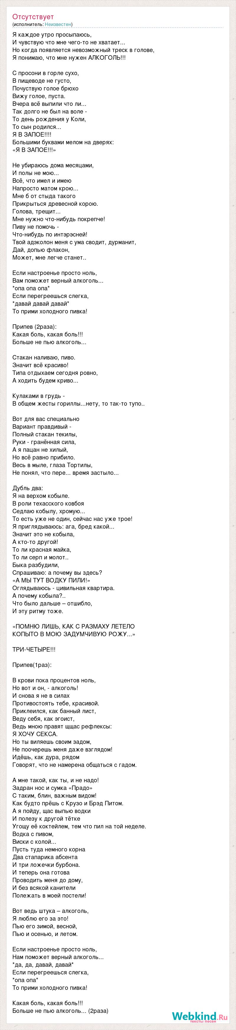 Я каждое утро просыпаюсь, И чувствую что мне чего-то не хватает... Но когда появляется невозможный треск в голове, Я понимаю, что мне нужен АЛКОГОЛЬ!!! С просони в горле сухо, В пищеводе не густо, Почуствую голое брюхо Вижу голое, пуста. Вчера всё выпили что ли... Так долго не был на воле - То день рождения у Коли, То сын родился... Я В ЗАПОЕ!!!! Большими буквами мелом на дверях: «Я В ЗАПОЕ!!!» Не убираюсь дома месяцами, И полы не мою... Всё, что имел и имею Напросто матом крою... Мне б от стыда такого Прикрыться древесной корою. Голова, трещит... Мне нужно что-нибудь покрепче! Пиву не помочь - Что-нибудь по интэрэсней! Твой адэколон меня с ума сводит, дурманит, Дай, допью флакон, Может, мне легче станет.. Если настроенье просто ноль, Вам поможет верный алкоголь... *опа опа опа* Если перегреешься слегка, *давай давай давай* То прими холодного пивка! Припев (2раза): Какая боль, какая боль!!! Больше не пью алкоголь... Стакан наливаю, пиво. Значит всё красиво! Типа отдыхаем сегодня ровно, А ходить будем криво... Кулаками в грудь - В общем жесты гориллы...нету, то так-то тупо.. Вот для вас специально Вариант правдивый - Полный стакан текилы, Руки - гранённая сила, А я пацан не хилый, Но всё равно прибило. Весь в мыле, глаза Тортилы, Не понял, что пере... время застыло... Дубль два: Я на верхом кобыле. В роли техасского ковбоя Седлаю кобылу, хромую... То есть уже не один, сейчас нас уже трое! Я приглядываюсь: ага, бред какой... Значит это не кобыла, А кто-то другой! То ли красная майка, То ли серп и молот.. Быка разбудили, Спрашиваю: а почему вы здесь? «А МЫ ТУТ ВОДКУ ПИЛИ!» Оглядываюсь - цивильная квартира. А почему кобыла?.. Что было дальше – отшибло, И эту ритму тоже. «ПОМНЮ ЛИШЬ, КАК С РАЗМАХУ ЛЕТЕЛО КОПЫТО В МОЮ ЗАДУМЧИВУЮ РОЖУ...» ТРИ-ЧЕТЫРЕ!!! Припев(1раз): В крови пока процентов ноль, Но вот и он, - алкоголь! И снова я не в силах Противостоять тебе, красивой. Приклеился, как банный лист, Веду себя, как эгоист, Ведь мною правят щщас рефлексы: Я ХОЧУ СЕКСА. Но ты виляешь своим задом, Не поочерешь меня даже взглядом! Идёшь, как дура, рядом Говорят, что не намерена общаться с гадом. А мне такой, как ты, и не надо! Задран нос и сумка «Прадо» С таким, блин, важным видом! Как будто прёшь с Крузо и Брэд Питом. А я пойду, щас выпью водки И полезу к другой тётке Угощу её коктейлем, тем что пил на той неделе. Водка с пивом, Виски с колой... Пусть туда немного корна Два стапарика абсента И три ложечки бурбона. И теперь она готова Проводить меня до дому, И без всякой канители Полежать в моей постели! Вот ведь штука – алкоголь, Я люблю его за это! Пью его зимой, весной, Пью и осенью, и летом. Если настроенье просто ноль, Нам поможет верный алкоголь... *да, да, давай, давай* Если перегреешься слегка, *опа опа* То прими холодного пивка! Какая боль, какая боль!!! Больше не пью алкоголь... (2раза)