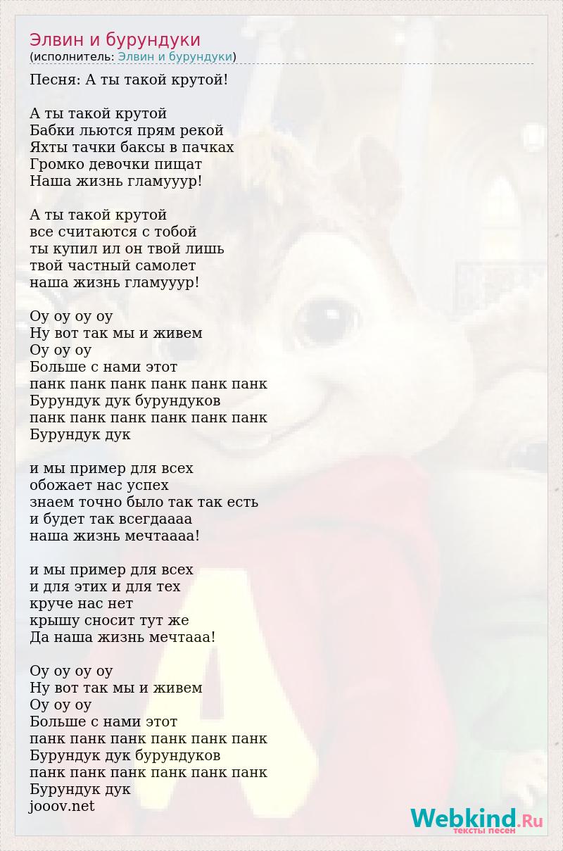 Песня: А ты такой крутой! А ты такой крутой Бабки льются прям рекой Яхты тачки баксы в пачках Громко девочки пищат Наша жизнь гламууур! А ты такой крутой все считаются с тобой ты купил ил он твой лишь твой частный самолет наша жизнь гламууур! Оу оу оу оу Ну вот так мы и живем Оу оу оу Больше с нами этот панк панк панк панк панк панк Бурундук дук бурундуков панк панк панк панк панк панк Бурундук дук и мы пример для всех обожает нас успех знаем точно было так так есть и будет так всегдаааа наша жизнь мечтаааа! и мы пример для всех и для этих и для тех круче нас нет крышу сносит тут же Да наша жизнь мечтааа! Оу оу оу оу Ну вот так мы и живем Оу оу оу Больше с нами этот панк панк панк панк панк панк Бурундук дук бурундуков панк панк панк панк панк панк Бурундук дук jooov.net