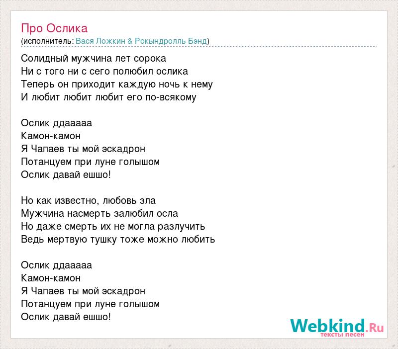 Солидный мужчина лет сорока Ни с того ни с сего полюбил ослика Теперь он приходит каждую ночь к нему И любит любит любит его по-всякому Ослик ддааааа Камон-камон Я Чапаев ты мой эскадрон Потанцуем при луне голышом Ослик давай ешшо! Но как известно, любовь зла Мужчина насмерть залюбил осла Но даже смерть их не могла разлучить Ведь мертвую тушку тоже можно любить Ослик ддааааа Камон-камон Я Чапаев ты мой эскадрон Потанцуем при луне голышом Ослик давай ешшо!