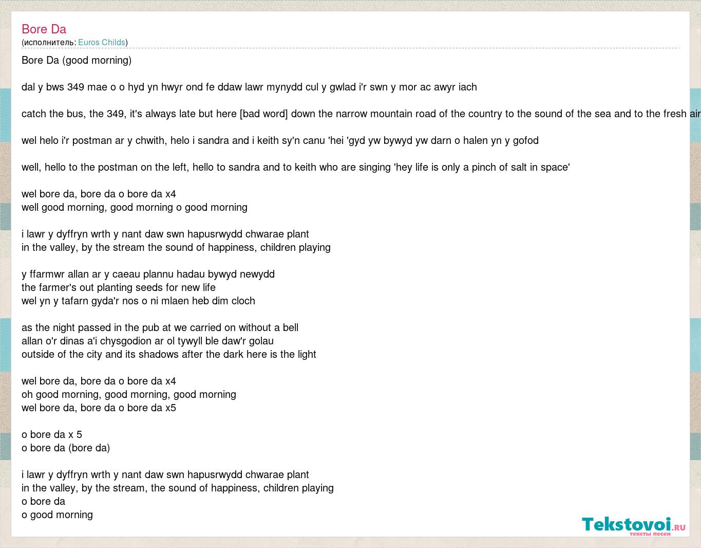 Bore Da (good morning) dal y bws 349 mae o o hyd yn hwyr ond fe ddaw lawr mynydd cul y gwlad i'r swn y mor ac awyr iach catch the bus, the 349, it's always late but here it comes down the narrow mountain road of the country to the sound of the sea and to the fresh air wel helo i'r postman ar y chwith, helo i sandra and i keith sy'n canu 'hei 'gyd yw bywyd yw darn o halen yn y gofod well, hello to the postman on the left, hello to sandra and to keith who are singing 'hey life is only a pinch of salt in space' wel bore da, bore da o bore da x4 well good morning, good morning o good morning i lawr y dyffryn wrth y nant daw swn hapusrwydd chwarae plant in the valley, by the stream the sound of happiness, children playing y ffarmwr allan ar y caeau plannu hadau bywyd newydd the farmer's out planting seeds for new life wel yn y tafarn gyda'r nos o ni mlaen heb dim cloch as the night passed in the pub at we carried on without a bell allan o'r dinas a'i chysgodion ar ol tywyll ble daw'r golau outside of the city and its shadows after the dark here is the light wel bore da, bore da o bore da x4 oh good morning, good morning, good morning wel bore da, bore da o bore da x5 o bore da x 5 o bore da (bore da) i lawr y dyffryn wrth y nant daw swn hapusrwydd chwarae plant in the valley, by the stream, the sound of happiness, children playing o bore da o good morning