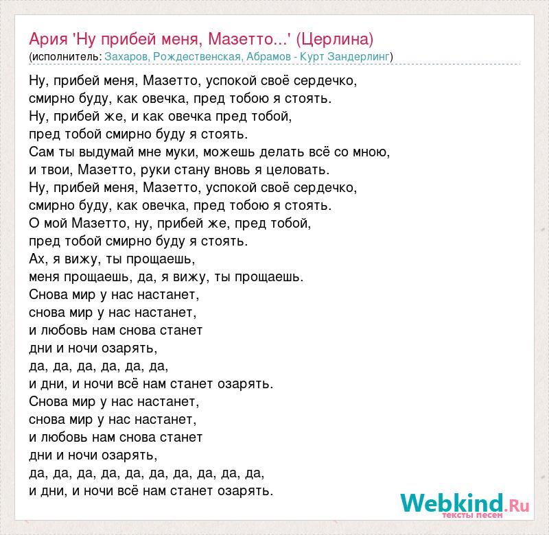 Ну, прибей меня, Мазетто, успокой своё сердечко, смирно буду, как овечка, пред тобою я стоять. Ну, прибей же, и как овечка пред тобой, пред тобой смирно буду я стоять. Сам ты выдумай мне муки, можешь делать всё со мною, и твои, Мазетто, руки стану вновь я целовать. Ну, прибей меня, Мазетто, успокой своё сердечко, смирно буду, как овечка, пред тобою я стоять. О мой Мазетто, ну, прибей же, пред тобой, пред тобой смирно буду я стоять. Ах, я вижу, ты прощаешь, меня прощаешь, да, я вижу, ты прощаешь. Снова мир у нас настанет, снова мир у нас настанет, и любовь нам снова станет дни и ночи озарять, да, да, да, да, да, да, и дни, и ночи всё нам станет озарять. Снова мир у нас настанет, снова мир у нас настанет, и любовь нам снова станет дни и ночи озарять, да, да, да, да, да, да, да, да, да, да, и дни, и ночи всё нам станет озарять.