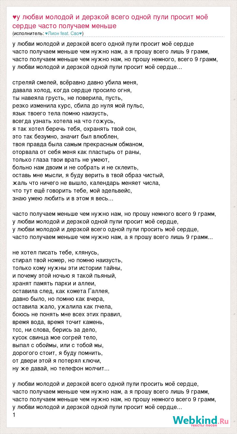 у любви молодой и дерзкой всего одной пули просит моё сердце часто получаем меньше чем нужно нам, а я прошу всего лишь 9 грамм, часто получаем меньше чем нужно нам, но прошу немного, всего 9 грамм, у любви молодой и дерзкой одной пули просит моё сердце... стреляй смелей, всёравно давно убила меня, давала холод, когда сердце просило огня, ты навеяла грусть, не поверила, пусть, резко изменила курс, сбила до нуля мой пульс, язык твоего тела помню наизусть, всегда узнать хотела на что гожусь, я так хотел беречь тебя, охранять твой сон, это так безумно, значит был влюблен, твоя правда была самым прекрасным обманом, оторвала от себя меня как пластырь от раны, только глаза твои врать не умеют, больно нам двоим и не собрать и не склеить, оставь мне мысли, я буду верить в твой образ чистый, жаль что ничего не вышло, календарь меняет числа, что тут ещё говорить тебе, мой эдельвейс, знаю умею любить и в этом я весь... часто получаем меньше чем нужно нам, но прошу немного всего 9 грамм, у любви молодой и дерзкой одной пули просит моё сердце, у любви молодой и дерзкой всего одной пули просить моё сердце, часто получаем меньше чем нужно нам, а я прошу всего лишь 9 грамм... не хотел писать тебе, клянусь, стирал твой номер, но помню наизусть, только кому нужны эти истории тайны, и почему этой ночью я такой пьяный, хранят память парки и аллеи, оставила след, как комета Галлея, давно было, но помню как вчера, оставила жало, ужалила как пчела, боюсь не понять мне всех этих правил, время вода, время точит камень, тсс, ни слова, берись за дело, кусок свинца мое согрей тело, выпал с обоймы, или с тобой мы, дорогого стоит, я буду помнить, от двери этой я потерял ключи, ну же давай, но телефон молчит... у любви молодой и дерзкой всего одной пули просить моё сердце, часто получаем меньше чем нужно нам, а я прошу всего лишь 9 грамм, часто получаем меньше чем нужно нам, но прошу немного всего 9 грамм, у любви молодой и дерзкой одной пули просит моё сердце... 1