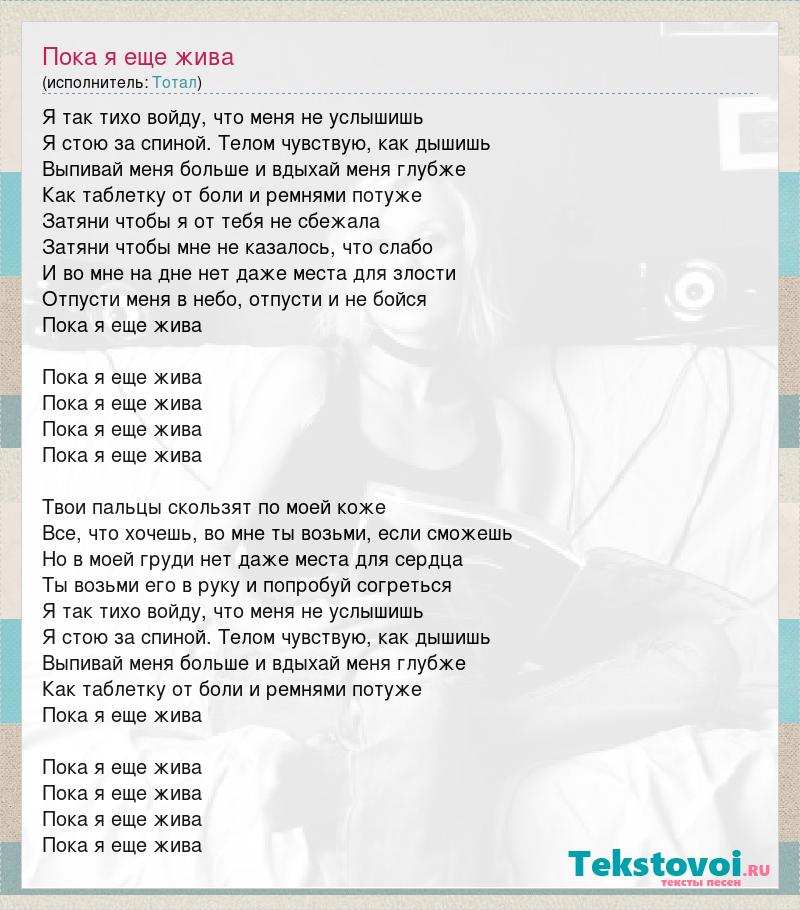 Я так тихо войду, что меня не услышишь Я стою за спиной. Телом чувствую, как дышишь Выпивай меня больше и вдыхай меня глубже Как таблетку от боли и ремнями потуже Затяни чтобы я от тебя не сбежала Затяни чтобы мне не казалось, что слабо И во мне на дне нет даже места для злости Отпусти меня в небо, отпусти и не бойся Пока я еще жива Пока я еще жива Пока я еще жива Пока я еще жива Пока я еще жива Твои пальцы скользят по моей коже Все, что хочешь, во мне ты возьми, если сможешь Но в моей груди нет даже места для сердца Ты возьми его в руку и попробуй согреться Я так тихо войду, что меня не услышишь Я стою за спиной. Телом чувствую, как дышишь Выпивай меня больше и вдыхай меня глубже Как таблетку от боли и ремнями потуже Пока я еще жива Пока я еще жива Пока я еще жива Пока я еще жива Пока я еще жива