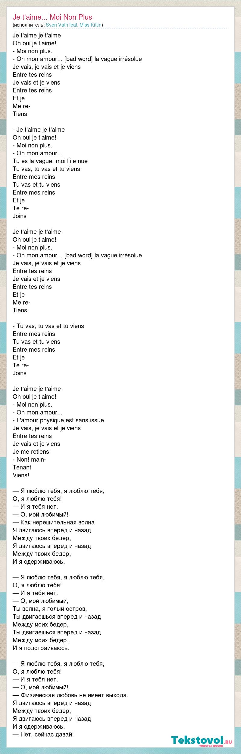 Je t'aime je t'aime Oh oui je t'aime! - Moi non plus. - Oh mon amour... - Comme la vague irrésolue Je vais, je vais et je viens Entre tes reins Je vais et je viens Entre tes reins Et je Me re- Tiens - Je t'aime je t'aime Oh oui je t'aime! - Moi non plus. - Oh mon amour... Tu es la vague, moi l'île nue Tu vas, tu vas et tu viens Entre mes reins Tu vas et tu viens Entre mes reins Et je Te re- Joins Je t'aime je t'aime Oh oui je t'aime! - Moi non plus. - Oh mon amour... - Comme la vague irrésolue Je vais, je vais et je viens Entre tes reins Je vais et je viens Entre tes reins Et je Me re- Tiens - Tu vas, tu vas et tu viens Entre mes reins Tu vas et tu viens Entre mes reins Et je Te re- Joins Je t'aime je t'aime Oh oui je t'aime! - Moi non plus. - Oh mon amour... - L'amour physique est sans issue Je vais, je vais et je viens Entre tes reins Je vais et je viens Je me retiens - Non! main- Tenant Viens! — Я люблю тебя, я люблю тебя, О, я люблю тебя! — И я тебя нет. — О, мой любимый! — Как нерешительная волна Я двигаюсь вперед и назад Между твоих бедер, Я двигаюсь вперед и назад Между твоих бедер, И я сдерживаюсь. — Я люблю тебя, я люблю тебя, О, я люблю тебя! — И я тебя нет. — О, мой любимый, Ты волна, я голый остров, Ты двигаешься вперед и назад Между моих бедер, Ты двигаешься вперед и назад Между моих бедер, И я подстраиваюсь. — Я люблю тебя, я люблю тебя, О, я люблю тебя! — И я тебя нет. — О, мой любимый! — Физическая любовь не имеет выхода. Я двигаюсь вперед и назад Между твоих бедер, Я двигаюсь вперед и назад И я сдерживаюсь. — Нет, сейчас давай!