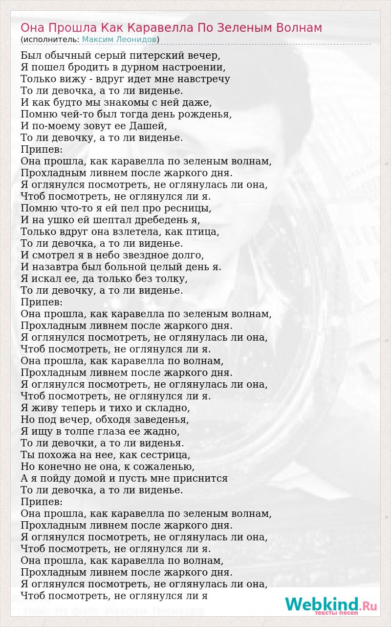 Был обычный серый питерский вечер, Я пошел бродить в дурном настроении, Только вижу - вдруг идет мне навстречу То ли девочка, а то ли виденье. И как будто мы знакомы с ней даже, Помню чей-то был тогда день рожденья, И по-моему зовут ее Дашей, То ли девочку, а то ли виденье. Припев: Она прошла, как каравелла по зеленым волнам, Прохладным ливнем после жаркого дня. Я оглянулся посмотреть, не оглянулась ли она, Чтоб посмотреть, не оглянулся ли я. Помню что-то я ей пел про ресницы, И на ушко ей шептал дребедень я, Только вдруг она взлетела, как птица, То ли девочка, а то ли виденье. И смотрел я в небо звездное долго, И назавтра был больной целый день я. Я искал ее, да только без толку, То ли девочку, а то ли виденье. Припев: Она прошла, как каравелла по зеленым волнам, Прохладным ливнем после жаркого дня. Я оглянулся посмотреть, не оглянулась ли она, Чтоб посмотреть, не оглянулся ли я. Она прошла, как каравелла по волнам, Прохладным ливнем после жаркого дня. Я оглянулся посмотреть, не оглянулась ли она, Чтоб посмотреть, не оглянулся ли я. Я живу теперь и тихо и складно, Но под вечер, обходя заведенья, Я ищу в толпе глаза ее жадно, То ли девочки, а то ли виденья. Ты похожа на нее, как сестрица, Но конечно не она, к сожаленью, А я пойду домой и пусть мне приснится То ли девочка, а то ли виденье. Припев: Она прошла, как каравелла по зеленым волнам, Прохладным ливнем после жаркого дня. Я оглянулся посмотреть, не оглянулась ли она, Чтоб посмотреть, не оглянулся ли я. Она прошла, как каравелла по волнам, Прохладным ливнем после жаркого дня. Я оглянулся посмотреть, не оглянулась ли она, Чтоб посмотреть, не оглянулся ли я