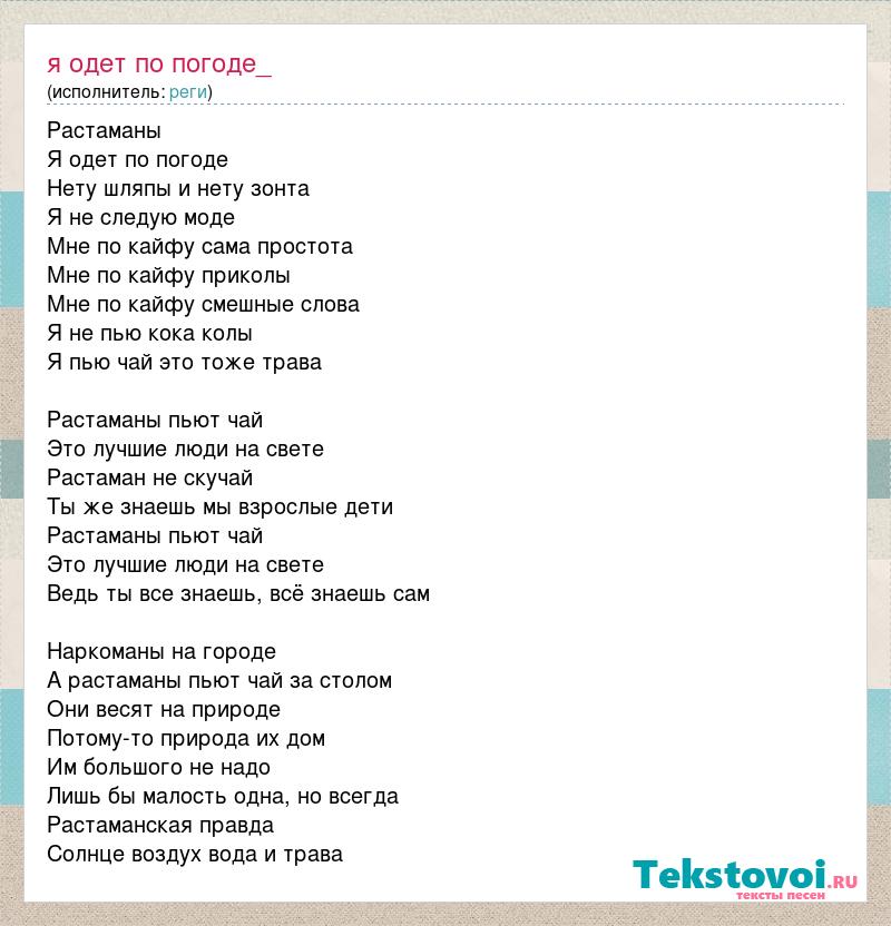 Растаманы Я одет по погоде Нету шляпы и нету зонта Я не следую моде Мне по кайфу сама простота Мне по кайфу приколы Мне по кайфу смешные слова Я не пью кока колы Я пью чай это тоже трава Растаманы пьют чай Это лучшие люди на свете Растаман не скучай Ты же знаешь мы взрослые дети Растаманы пьют чай Это лучшие люди на свете Ведь ты все знаешь, всё знаешь сам Наркоманы на городе А растаманы пьют чай за столом Они весят на природе Потому-то природа их дом Им большого не надо Лишь бы малость одна, но всегда Растаманская правда Солнце воздух вода и трава