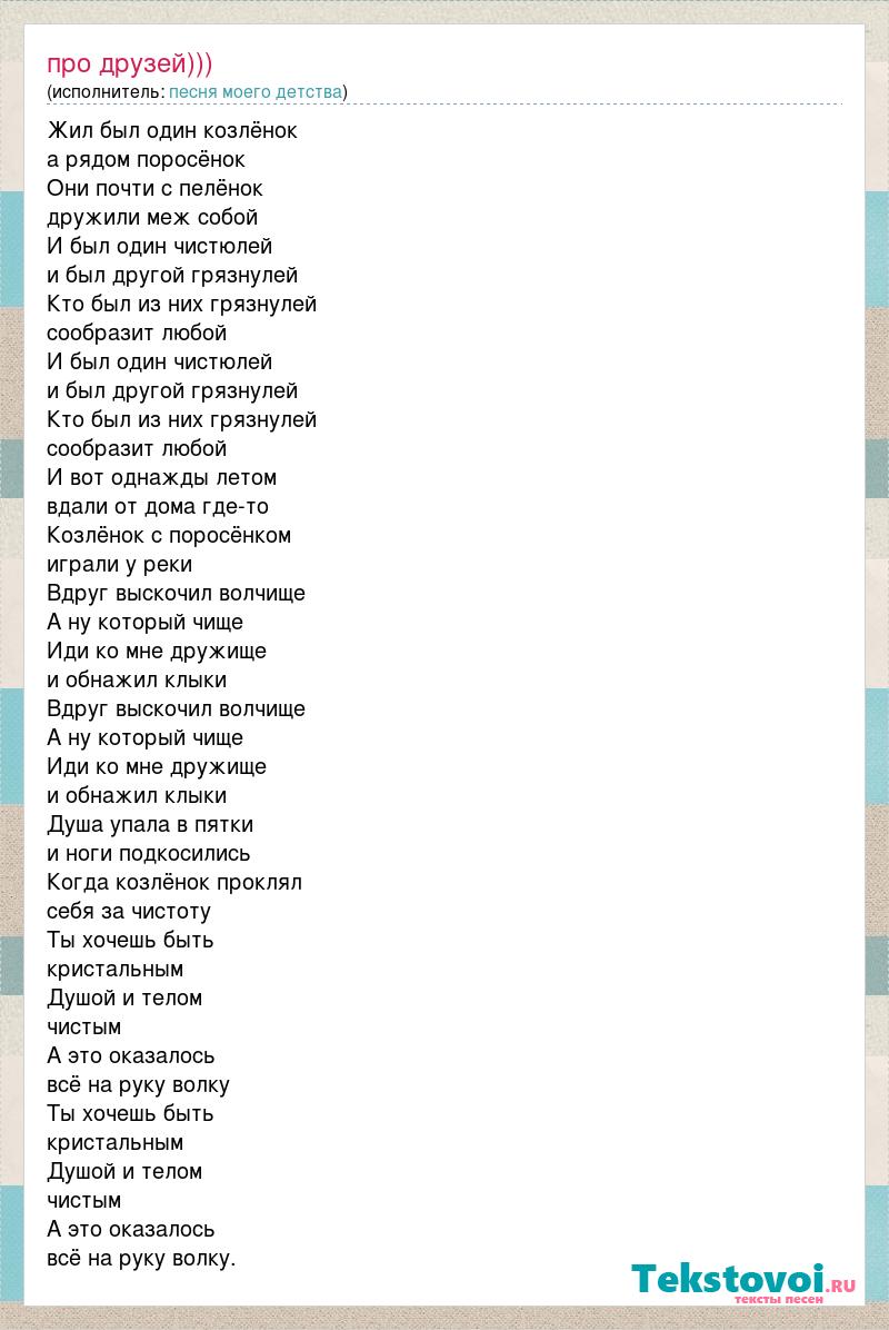 Жил был один козлёнок а рядом поросёнок Они почти с пелёнок дружили меж собой И был один чистюлей и был другой грязнулей Кто был из них грязнулей сообразит любой И был один чистюлей и был другой грязнулей Кто был из них грязнулей сообразит любой И вот однажды летом вдали от дома где-то Козлёнок с поросёнком играли у реки Вдруг выскочил волчище А ну который чище Иди ко мне дружище и обнажил клыки Вдруг выскочил волчище А ну который чище Иди ко мне дружище и обнажил клыки Душа упала в пятки и ноги подкосились Когда козлёнок проклял себя за чистоту Ты хочешь быть кристальным Душой и телом чистым А это оказалось всё на руку волку Ты хочешь быть кристальным Душой и телом чистым А это оказалось всё на руку волку.