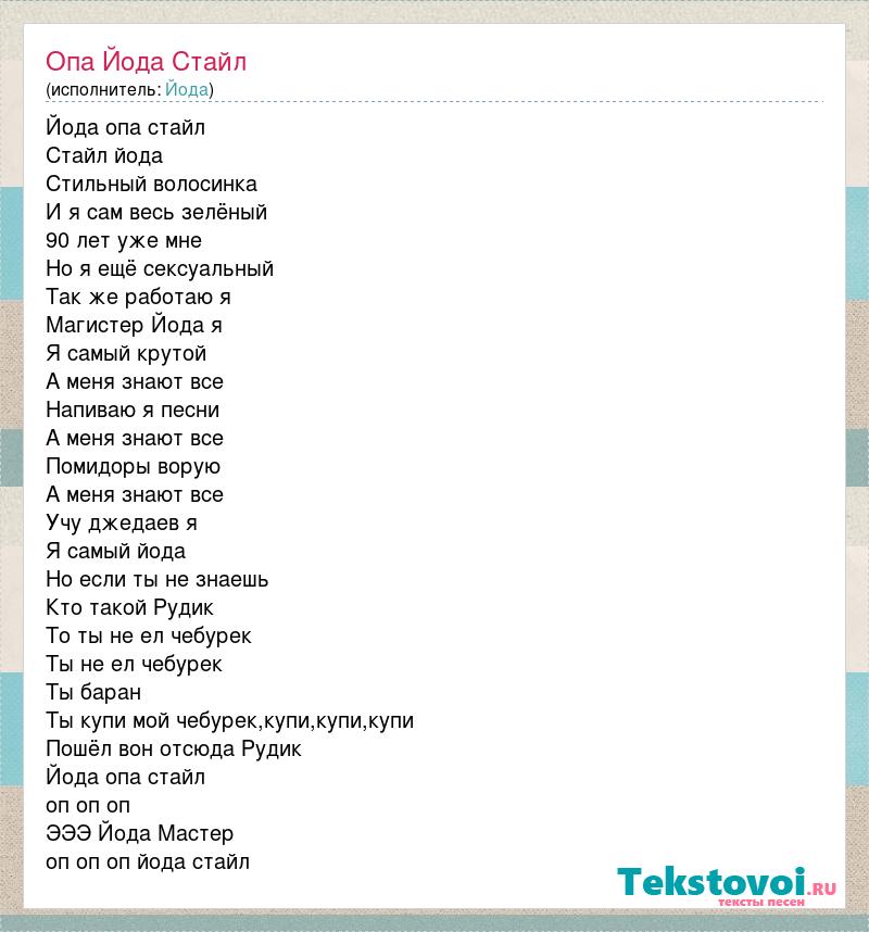 Йода опа стайл Стайл йода Стильный волосинка И я сам весь зелёный 90 лет уже мне Но я ещё сексуальный Так же работаю я Магистер Йода я Я самый крутой А меня знают все Напиваю я песни А меня знают все Помидоры ворую А меня знают все Учу джедаев я Я самый йода Но если ты не знаешь Кто такой Рудик То ты не ел чебурек Ты не ел чебурек Ты баран Ты купи мой чебурек,купи,купи,купи Пошёл вон отсюда Рудик Йода опа стайл оп оп оп ЭЭЭ Йода Мастер оп оп оп йода стайл