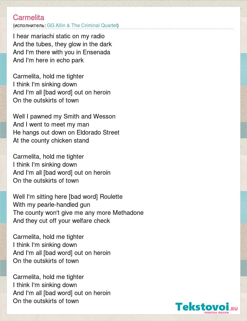 I hear mariachi static on my radio And the tubes, they glow in the dark And I'm there with you in Ensenada And I'm here in echo park Carmelita, hold me tighter I think I'm sinking down And I'm all [bad word] out on heroin On the outskirts of town Well I pawned my Smith and Wesson And I went to meet my man He hangs out down on Eldorado Street At the county chicken stand Carmelita, hold me tighter I think I'm sinking down And I'm all [bad word] out on heroin On the outskirts of town Well I'm sitting here [bad word] Roulette With my pearle-handled gun The county won't give me any more Methadone And they cut off your welfare check Carmelita, hold me tighter I think I'm sinking down And I'm all [bad word] out on heroin On the outskirts of town Carmelita, hold me tighter I think I'm sinking down And I'm all [bad word] out on heroin On the outskirts of town