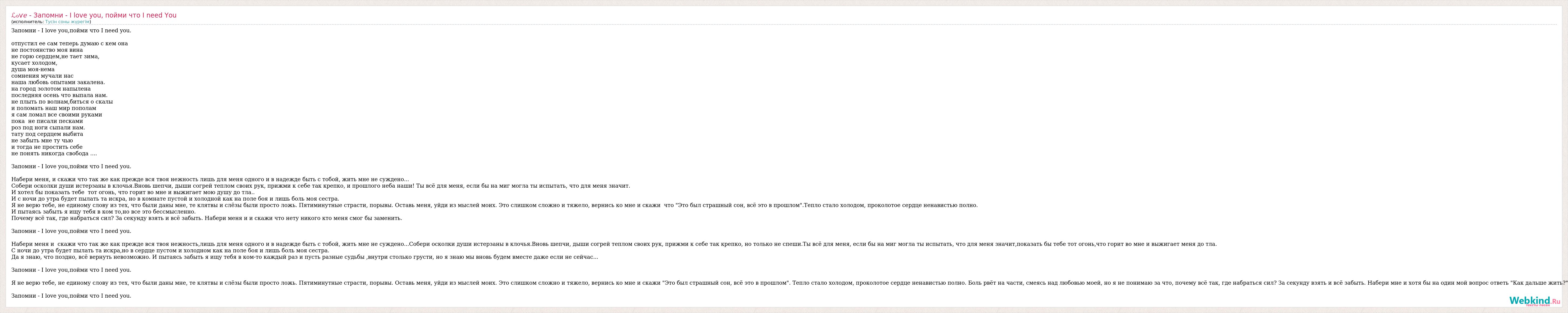 Запомни - I love you,пойми что I need you. отпустил ее сам теперь думаю с кем она не постоянство моя вина не горю сердцем,не тает зима, кусает холодом, душа моя-нема сомнения мучали нас наша любовь опытами закалена. на город золотом напылена последняя осень что выпала нам. не плыть по волнам,биться о скалы и поломать наш мир пополам я сам ломал все своими руками пока не писали песками роз под ноги сыпали нам. тату под сердцем выбита не забыть мне ту чью и тогда не простить себе не понять никогда свобода .... Запомни - I love you,пойми что I need you. Набери меня, и скажи что так же как прежде вся твоя нежность лишь для меня одного и в надежде быть с тобой, жить мне не суждено... Собери осколки души истерзаны в клочья.Вновь шепчи, дыши согрей теплом своих рук, прижми к себе так крепко, и прошлого неба наши! Ты всё для меня, если бы на миг могла ты испытать, что для меня значит. И хотел бы показать тебе тот огонь, что горит во мне и выжигает мою душу до тла.. И с ночи до утра будет пылать та искра, но в комнате пустой и холодной как на поле боя и лишь боль моя сестра. Я не верю тебе, не единому слову из тех, что были даны мне, те клятвы и слёзы были просто ложь. Пятиминутные страсти, порывы. Оставь меня, уйди из мыслей моих. Это слишком сложно и тяжело, вернись ко мне и скажи что "Это был страшный сон, всё это в прошлом".Тепло стало холодом, проколотое сердце ненавистью полно. И пытаясь забыть я ищу тебя в ком то,но все это бессмысленно. Почему всё так, где набраться сил? За секунду взять и всё забыть. Набери меня и и скажи что нету никого кто меня смог бы заменить. Запомни - I love you,пойми что I need you. Набери меня и скажи что так же как прежде вся твоя нежность,лишь для меня одного и в надежде быть с тобой, жить мне не суждено...Собери осколки души истерзаны в клочья.Вновь шепчи, дыши согрей теплом своих рук, прижми к себе так крепко, но только не спеши.Ты всё для меня, если бы на миг могла ты испытать, что для меня значит,показать бы тебе тот огонь,что горит во мне и выжигает меня до тла. С ночи до утра будет пылать та искра,но в сердце пустом и холодном как на поле боя и лишь боль моя сестра. Да я знаю, что поздно, всё вернуть невозможно. И пытаясь забыть я ищу тебя в ком-то каждый раз и пусть разные судьбы ,внутри столько грусти, но я знаю мы вновь будем вместе даже если не сейчас... Запомни - I love you,пойми что I need you. Я не верю тебе, не единому слову из тех, что были даны мне, те клятвы и слёзы были просто ложь. Пятиминутные страсти, порывы. Оставь меня, уйди из мыслей моих. Это слишком сложно и тяжело, вернись ко мне и скажи "Это был страшный сон, всё это в прошлом". Тепло стало холодом, проколотое сердце ненавистью полно. Боль рвёт на части, смеясь над любовью моей, но я не понимаю за что, почему всё так, где набраться сил? За секунду взять и всё забыть. Набери мне и хотя бы на один мой вопрос ответь "Как дальше жить?" Запомни - I love you,пойми что I need you.