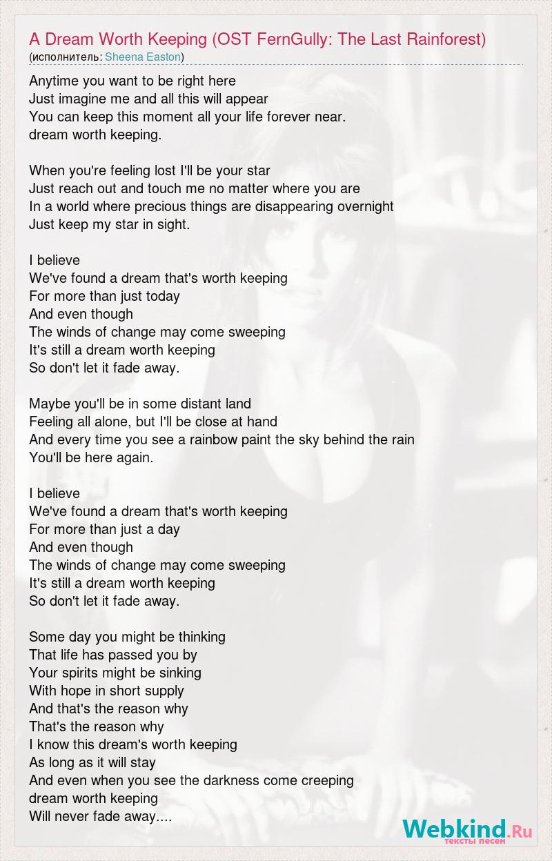 Anytime you want to be right here Just imagine me and all this will appear You can keep this moment all your life forever near. dream worth keeping. When you're feeling lost I'll be your star Just reach out and touch me no matter where you are In a world where precious things are disappearing overnight Just keep my star in sight. I believe We've found a dream that's worth keeping For more than just today And even though The winds of change may come sweeping It's still a dream worth keeping So don't let it fade away. Maybe you'll be in some distant land Feeling all alone, but I'll be close at hand And every time you see a rainbow paint the sky behind the rain You'll be here again. I believe We've found a dream that's worth keeping For more than just a day And even though The winds of change may come sweeping It's still a dream worth keeping So don't let it fade away. Some day you might be thinking That life has passed you by Your spirits might be sinking With hope in short supply And that's the reason why That's the reason why I know this dream's worth keeping As long as it will stay And even when you see the darkness come creeping dream worth keeping Will never fade away....