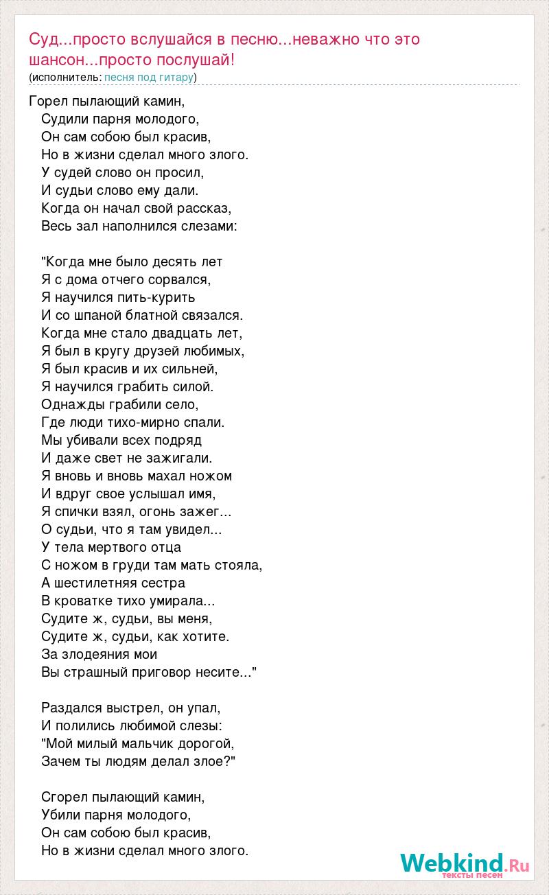 Горел пылающий камин, Судили парня молодого, Он сам собою был красив, Но в жизни сделал много злого. У судей слово он просил, И судьи слово ему дали. Когда он начал свой рассказ, Весь зал наполнился слезами: "Когда мне было десять лет Я с дома отчего сорвался, Я научился пить-курить И со шпаной блатной связался. Когда мне стало двадцать лет, Я был в кругу друзей любимых, Я был красив и их сильней, Я научился грабить силой. Однажды грабили село, Где люди тихо-мирно спали. Мы убивали всех подряд И даже свет не зажигали. Я вновь и вновь махал ножом И вдруг свое услышал имя, Я спички взял, огонь зажег... О судьи, что я там увидел... У тела мертвого отца С ножом в груди там мать стояла, А шестилетняя сестра В кроватке тихо умирала... Судите ж, судьи, вы меня, Судите ж, судьи, как хотите. За злодеяния мои Вы страшный приговор несите..." Раздался выстрел, он упал, И полились любимой слезы: "Мой милый мальчик дорогой, Зачем ты людям делал злое?" Сгорел пылающий камин, Убили парня молодого, Он сам собою был красив, Но в жизни сделал много злого.