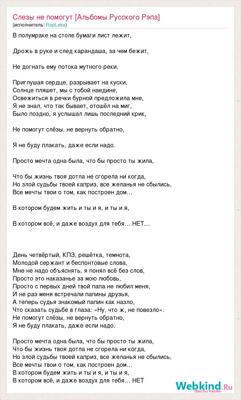 В полумраке на столе бумаги лист лежит, Дрожь в руке и след карандаша, за чем бежит, Не догнать ему потока мутного реки, Приглушая сердце, разрывает на куски, Солнце пляшет, мы с тобой наедине, Освежиться в речки бурной предложила мне, Я не знал, что так бывает, отошёл на миг, Было поздно, я услышал лишь последний крик, Не помогут слёзы, не вернуть обратно, Я не буду плакать, даже если надо. Просто мечта одна была, что бы просто ты жила, Что бы жизнь твоя дотла не сгорела ни когда, Но злой судьбы твоей каприз, все желанья не сбылись, Все мечты твои о том, как построен дом… В котором будем жить и ты и я, и ты и я, В котором всё, и даже воздух для тебя… НЕТ… День четвёртый, КПЗ, решётка, темнота, Молодой сержант и беспонтовые слова, Мне не надо объяснять, я понял всё без слов, Просто это наказанье за мою любовь, Просто с первых дней твой папа не любил меня, И не раз меня встречали папины друзья, А теперь судья знакомый папин как назло, Что сказать судьбе в глаза: «Ну, что ж, не повезло». Не помогут слёзы, не вернуть обратно, Я не буду плакать, даже если надо. Просто мечта одна была, что бы просто ты жила, Что бы жизнь твоя дотла не сгорела ни когда, Но злой судьбы твоей каприз, все желанья не сбылись, Все мечты твои о том, как построен дом… В котором будем жить и ты и я, и ты и я, В котором всё, и даже воздух для тебя… НЕТ