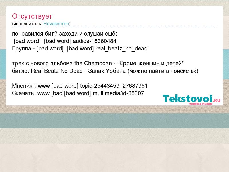 понравился бит? заходи и слушай ещё: [bad word] [bad word] audios-18360484 Группа - [bad word] [bad word] real_beatz_no_dead трек с нового альбома the Chemodan - "Кроме женщин и детей" битло: Real Beatz No Dead - Запах Урбана (можно найти в поиске вк) Мнения : www [bad word] topic-25443459_27687951 Скачать: www [bad word] ru/multimedia/id-38307
