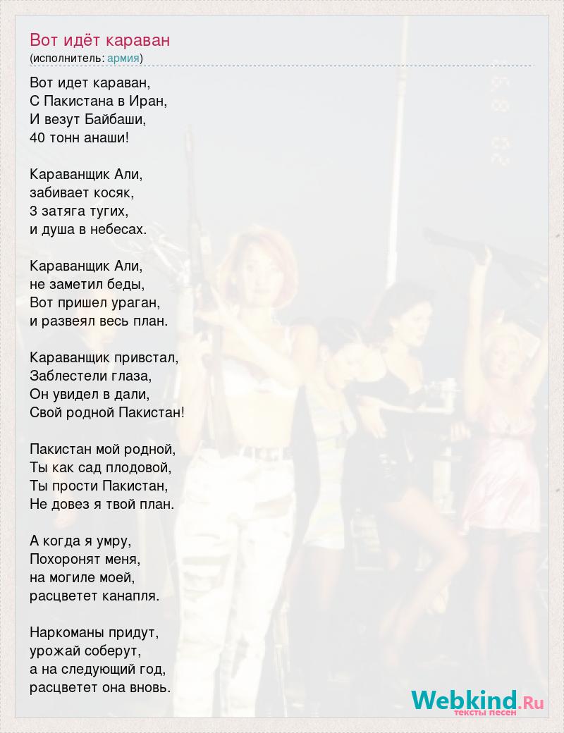 Вот идет караван, С Пакистана в Иран, И везут Байбаши, 40 тонн анаши! Караванщик Али, забивает косяк, 3 затяга тугих, и душа в небесах. Караванщик Али, не заметил беды, Вот пришел ураган, и развеял весь план. Караванщик привстал, Заблестели глаза, Он увидел в дали, Свой родной Пакистан! Пакистан мой родной, Ты как сад плодовой, Ты прости Пакистан, Не довез я твой план. А когда я умру, Похоронят меня, на могиле моей, расцветет канапля. Наркоманы придут, урожай соберут, а на следующий год, расцветет она вновь.