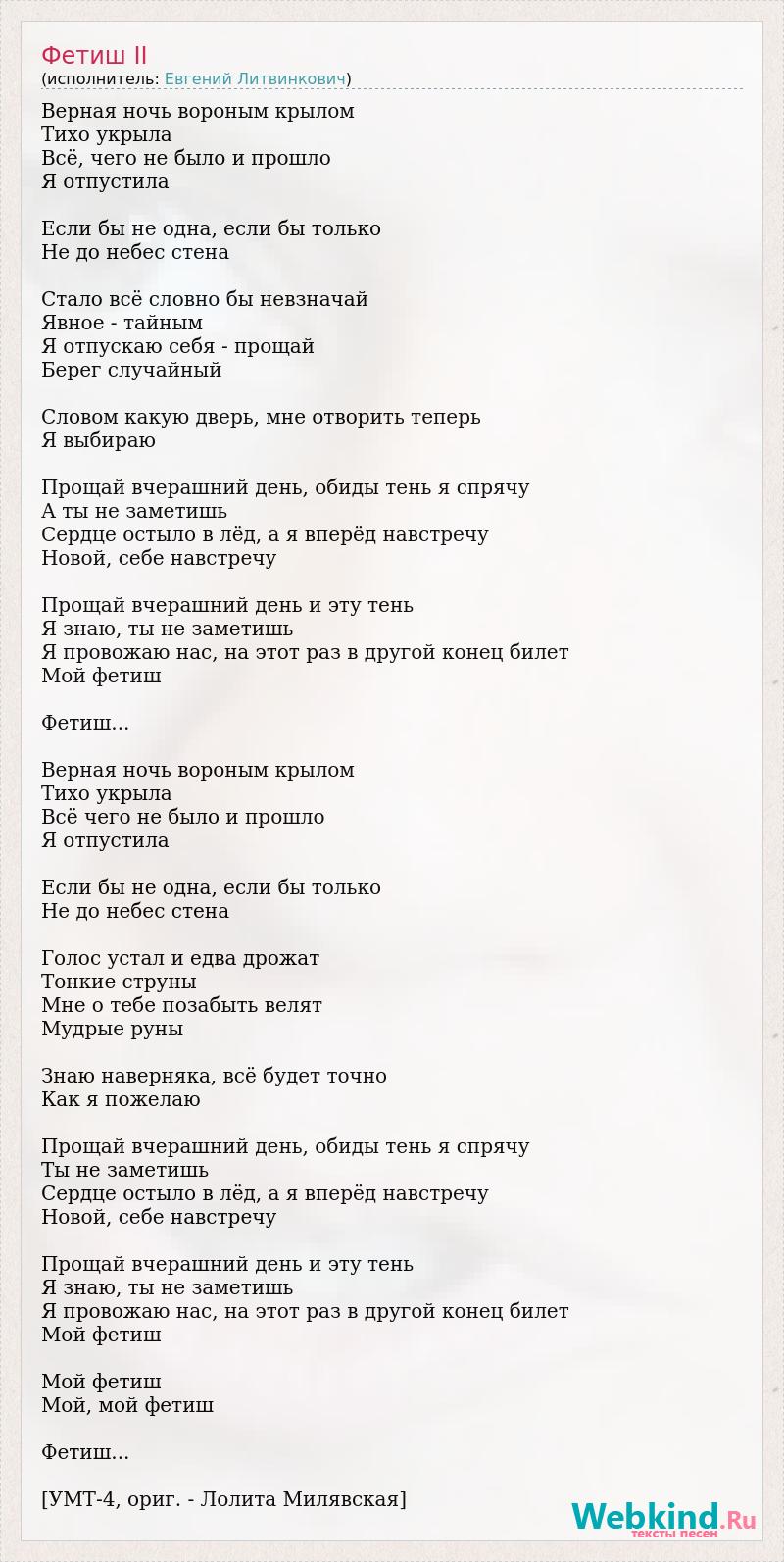 Верная ночь вороным крылом Тихо укрыла Всё, чего не было и прошло Я отпустила Если бы не одна, если бы только Не до небес стена Стало всё словно бы невзначай Явное - тайным Я отпускаю себя - прощай Берег случайный Словом какую дверь, мне отворить теперь Я выбираю Прощай вчерашний день, обиды тень я спрячу А ты не заметишь Сердце остыло в лёд, а я вперёд навстречу Новой, себе навстречу Прощай вчерашний день и эту тень Я знаю, ты не заметишь Я провожаю нас, на этот раз в другой конец билет Мой фетиш Фетиш... Верная ночь вороным крылом Тихо укрыла Всё чего не было и прошло Я отпустила Если бы не одна, если бы только Не до небес стена Голос устал и едва дрожат Тонкие струны Мне о тебе позабыть велят Мудрые руны Знаю наверняка, всё будет точно Как я пожелаю Прощай вчерашний день, обиды тень я спрячу Ты не заметишь Сердце остыло в лёд, а я вперёд навстречу Новой, себе навстречу Прощай вчерашний день и эту тень Я знаю, ты не заметишь Я провожаю нас, на этот раз в другой конец билет Мой фетиш Мой фетиш Мой, мой фетиш Фетиш... [УМТ-4, ориг. - Лолита Милявская]