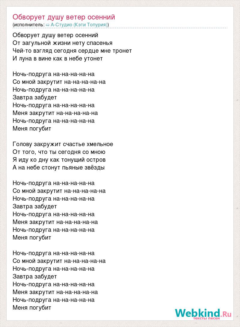 Обворует душу ветер осенний От загульной жизни нету спасенья Чей-то взгляд сегодня сердце мне тронет И луна в вине как в небе утонет Ночь-подруга на-на-на-на-на Со мной закрутит на-на-на-на-на Ночь-подруга на-на-на-на-на Завтра забудет Ночь-подруга на-на-на-на-на Меня закрутит на-на-на-на-на Ночь-подруга на-на-на-на-на Меня погубит Голову закружит счастье хмельное От того, что ты сегодня со мною Я иду ко дну как тонущий остров А на небе стонут пьяные звёзды Ночь-подруга на-на-на-на-на Со мной закрутит на-на-на-на-на Ночь-подруга на-на-на-на-на Завтра забудет Ночь-подруга на-на-на-на-на Меня закрутит на-на-на-на-на Ночь-подруга на-на-на-на-на Меня погубит Ночь-подруга на-на-на-на-на Со мной закрутит на-на-на-на-на Ночь-подруга на-на-на-на-на Завтра забудет Ночь-подруга на-на-на-на-на Меня закрутит на-на-на-на-на Ночь-подруга на-на-на-на-на Меня погубит