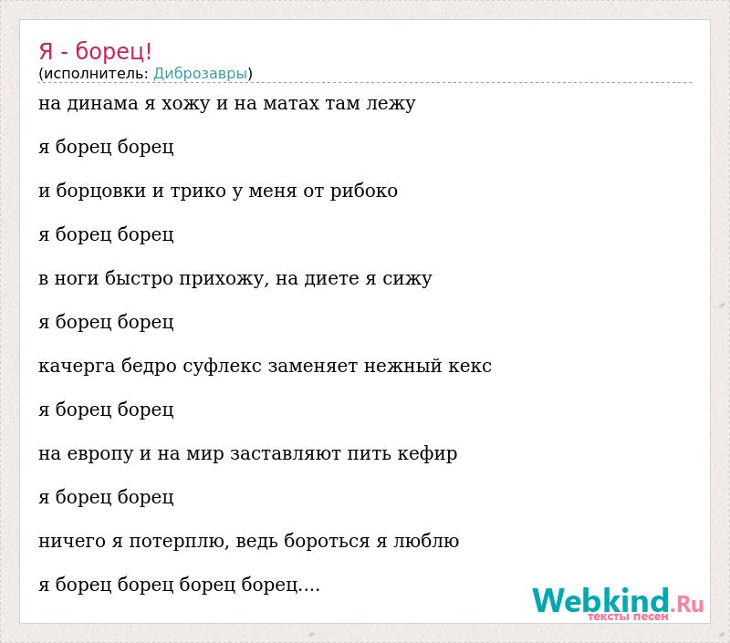 на динама я хожу и на матах там лежу я борец борец и борцовки и трико у меня от рибоко я борец борец в ноги быстро прихожу, на диете я сижу я борец борец качерга бедро суфлекс заменяет нежный кекс я борец борец на европу и на мир заставляют пить кефир я борец борец ничего я потерплю, ведь бороться я люблю я борец борец борец борец....