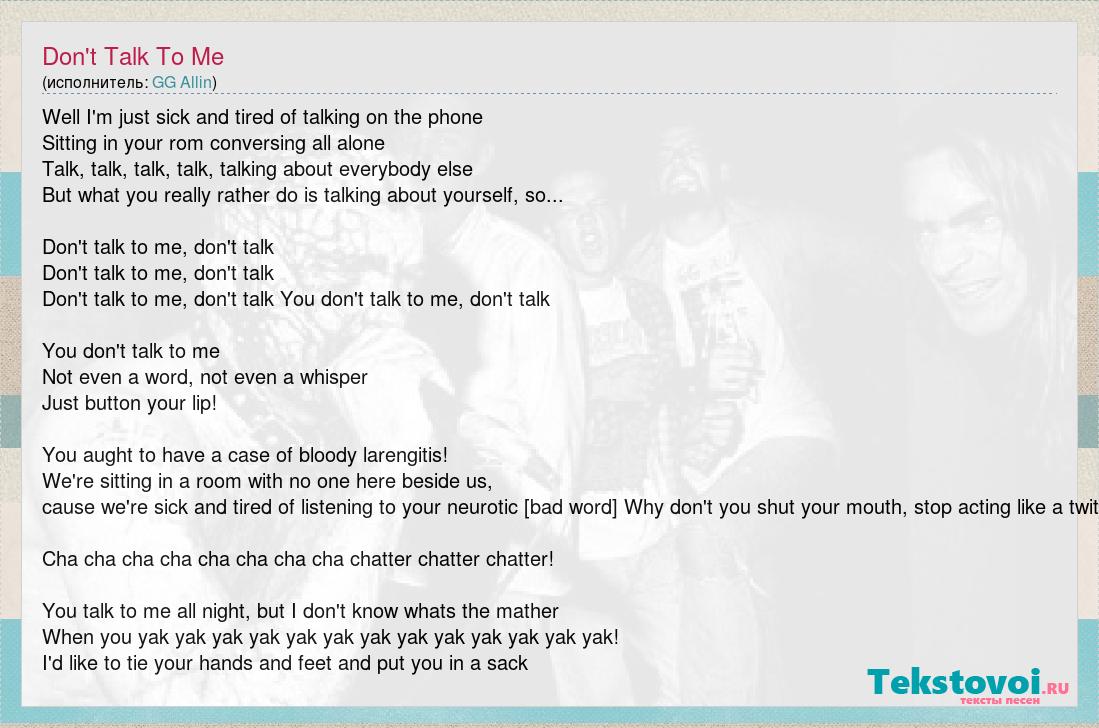 Well I'm just sick and tired of talking on the phone Sitting in your rom conversing all alone Talk, talk, talk, talk, talking about everybody else But what you really rather do is talking about yourself, so... Don't talk to me, don't talk Don't talk to me, don't talk Don't talk to me, don't talk You don't talk to me, don't talk You don't talk to me Not even a word, not even a whisper Just button your lip! You aught to have a case of bloody larengitis! We're sitting in a room with no one here beside us, cause we're sick and tired of listening to your neurotic [bad word] Why don't you shut your mouth, stop acting like a twit Cha cha cha cha cha cha cha cha chatter chatter chatter! You talk to me all night, but I don't know whats the mather When you yak yak yak yak yak yak yak yak yak yak yak yak yak! I'd like to tie your hands and feet and put you in a sack