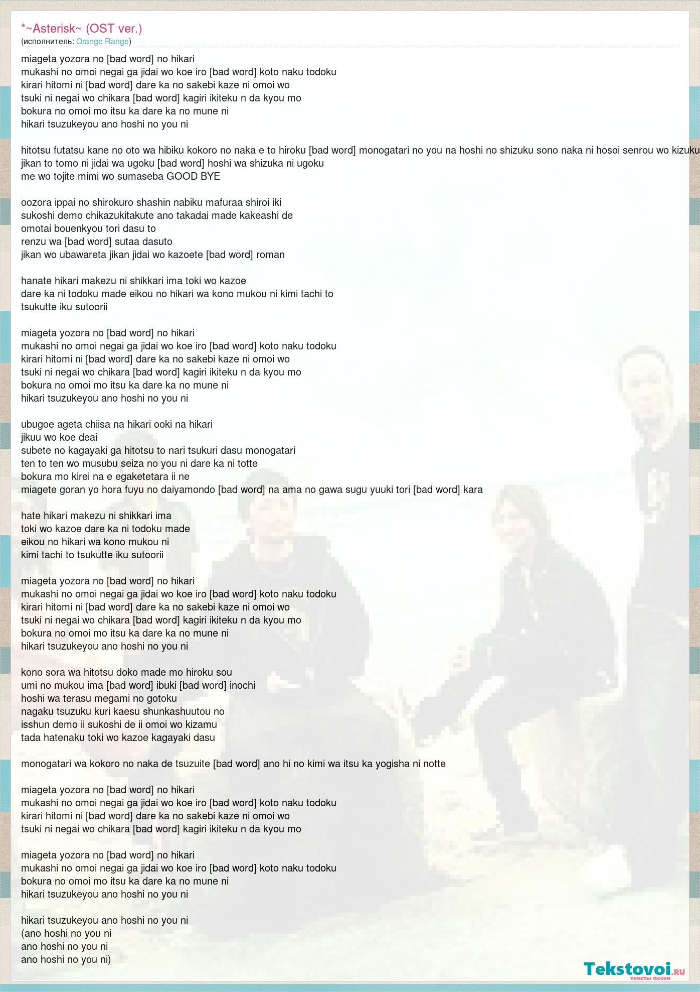 miageta yozora no [bad word] no hikari mukashi no omoi negai ga jidai wo koe iro aseru koto naku todoku kirari hitomi ni utsuru dare ka no sakebi kaze ni omoi wo tsuki ni negai wo chikara aru kagiri ikiteku n da kyou mo bokura no omoi mo itsu ka dare ka no mune ni hikari tsuzukeyou ano hoshi no you ni hitotsu futatsu kane no oto wa hibiku kokoro no naka e to hiroku [bad word] monogatari no you na hoshi no shizuku sono naka ni hosoi senrou wo kizuku jikan to tomo ni jidai wa ugoku nagareru hoshi wa shizuka ni ugoku me wo tojite mimi wo sumaseba GOOD BYE oozora ippai no shirokuro shashin nabiku mafuraa shiroi iki sukoshi demo chikazukitakute ano takadai made kakeashi de omotai bouenkyou tori dasu to renzu wa [bad word] sutaa dasuto jikan wo ubawareta jikan jidai wo kazoete kuru roman hanate hikari makezu ni shikkari ima toki wo kazoe dare ka ni todoku made eikou no hikari wa kono mukou ni kimi tachi to tsukutte iku sutoorii miageta yozora no [bad word] no hikari mukashi no omoi negai ga jidai wo koe iro aseru koto naku todoku kirari hitomi ni utsuru dare ka no sakebi kaze ni omoi wo tsuki ni negai wo chikara aru kagiri ikiteku n da kyou mo bokura no omoi mo itsu ka dare ka no mune ni hikari tsuzukeyou ano hoshi no you ni ubugoe ageta chiisa na hikari ooki na hikari jikuu wo koe deai subete no kagayaki ga hitotsu to nari tsukuri dasu monogatari ten to ten wo musubu seiza no you ni dare ka ni totte bokura mo kirei na e egaketetara ii ne miagete goran yo hora fuyu no daiyamondo yuruyaka na ama no gawa sugu yuuki tori modoseru kara hate hikari makezu ni shikkari ima toki wo kazoe dare ka ni todoku made eikou no hikari wa kono mukou ni kimi tachi to tsukutte iku sutoorii miageta yozora no [bad word] no hikari mukashi no omoi negai ga jidai wo koe iro aseru koto naku todoku kirari hitomi ni utsuru dare ka no sakebi kaze ni omoi wo tsuki ni negai wo chikara aru kagiri ikiteku n da kyou mo bokura no omoi mo itsu ka dare ka no mune ni hikari tsuzukeyou ano hoshi no you ni kono sora wa hitotsu doko made mo hiroku sou umi no mukou ima umareru ibuki taetareru inochi hoshi wa terasu megami no gotoku nagaku tsuzuku kuri kaesu shunkashuutou no isshun demo ii sukoshi de ii omoi wo kizamu tada hatenaku toki wo kazoe kagayaki dasu monogatari wa kokoro no naka de tsuzuite iru ano hi no kimi wa itsu ka yogisha ni notte miageta yozora no [bad word] no hikari mukashi no omoi negai ga jidai wo koe iro aseru koto naku todoku kirari hitomi ni utsuru dare ka no sakebi kaze ni omoi wo tsuki ni negai wo chikara aru kagiri ikiteku n da kyou mo miageta yozora no [bad word] no hikari mukashi no omoi negai ga jidai wo koe iro aseru koto naku todoku bokura no omoi mo itsu ka dare ka no mune ni hikari tsuzukeyou ano hoshi no you ni hikari tsuzukeyou ano hoshi no you ni (ano hoshi no you ni ano hoshi no you ni ano hoshi no you ni)