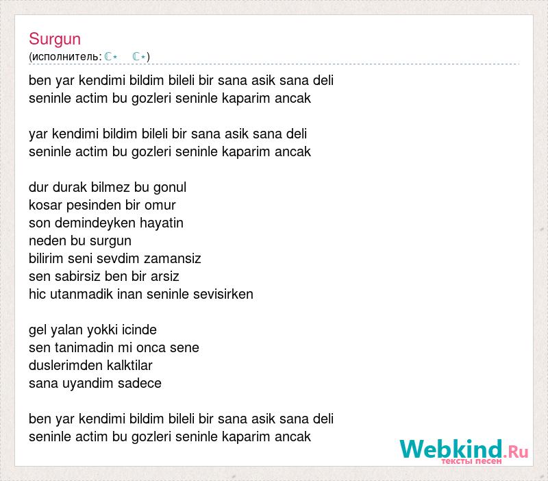 ben yar kendimi bildim bileli bir sana asik sana deli seninle actim bu gozleri seninle kaparim ancak yar kendimi bildim bileli bir sana asik sana deli seninle actim bu gozleri seninle kaparim ancak dur durak bilmez bu gonul kosar pesinden bir omur son demindeyken hayatin neden bu surgun bilirim seni sevdim zamansiz sen sabirsiz ben bir arsiz hic utanmadik inan seninle sevisirken gel yalan yokki icinde sen tanimadin mi onca sene duslerimden kalktilar sana uyandim sadece ben yar kendimi bildim bileli bir sana asik sana deli seninle actim bu gozleri seninle kaparim ancak