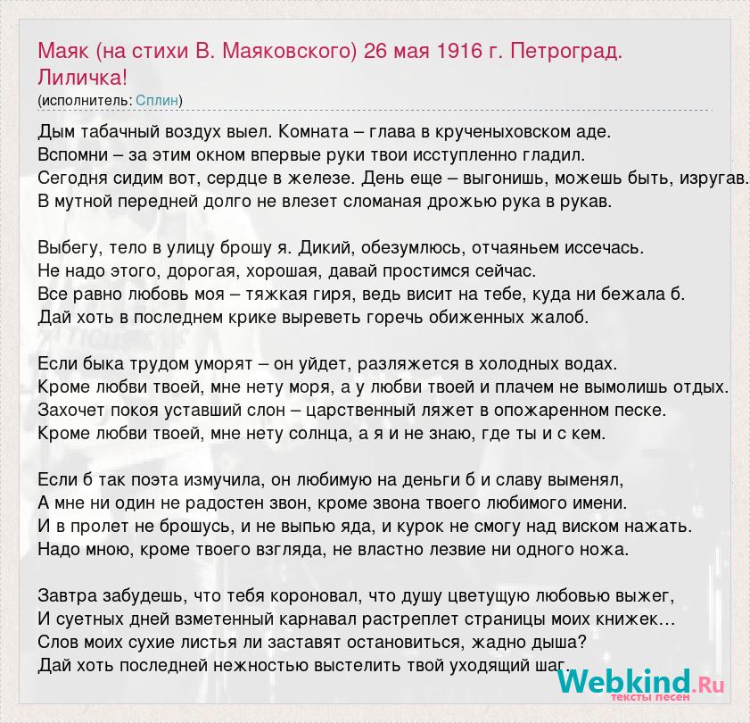 А как ты думаешь, о чем песня "Маяк (на стихи В. Маяковского) 26 мая 1916 г. Петроград. Лиличка! Вместо" ?