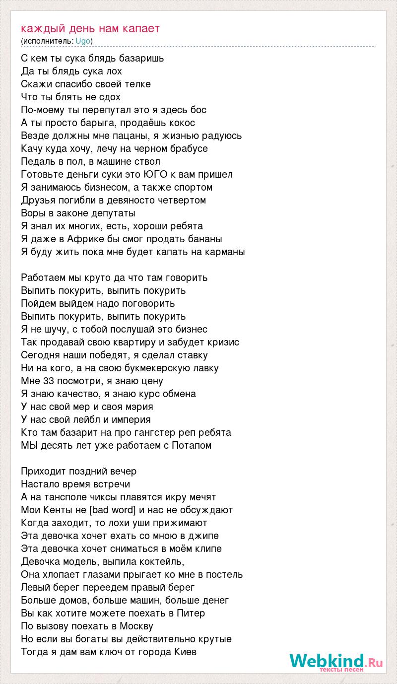 С кем ты сука блядь базаришь Да ты блядь сука лох Скажи спасибо своей телке Что ты блять не сдох По-моему ты перепутал это я здесь бос А ты просто барыга, продаёшь кокос Везде должны мне пацаны, я жизнью радуюсь Качу куда хочу, лечу на черном брабусе Педаль в пол, в машине ствол Готовьте деньги суки это ЮГО к вам пришел Я занимаюсь бизнесом, а также спортом Друзья погибли в девяносто четвертом Воры в законе депутаты Я знал их многих, есть, хороши ребята Я даже в Африке бы смог продать бананы Я буду жить пока мне будет капать на карманы Работаем мы круто да что там говорить Выпить покурить, выпить покурить Пойдем выйдем надо поговорить Выпить покурить, выпить покурить Я не шучу, с тобой послушай это бизнес Так продавай свою квартиру и забудет кризис Сегодня наши победят, я сделал ставку Ни на кого, а на свою букмекерскую лавку Мне 33 посмотри, я знаю цену Я знаю качество, я знаю курс обмена У нас свой мер и своя мэрия У нас свой лейбл и империя Кто там базарит на про гангстер реп ребята МЫ десять лет уже работаем с Потапом Приходит поздний вечер Настало время встречи А на тансполе чиксы плавятся икру мечят Мои Кенты не [bad word] и нас не обсуждают Когда заходит, то лохи уши прижимают Эта девочка хочет ехать со мною в джипе Эта девочка хочет сниматься в моём клипе Девочка модель, выпила коктейль, Она хлопает глазами прыгает ко мне в постель Левый берег переедем правый берег Больше домов, больше машин, больше денег Вы как хотите можете поехать в Питер По вызову поехать в Москву Но если вы богаты вы действительно крутые Тогда я дам вам ключ от города Киев