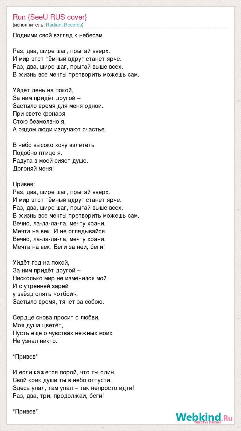 Подними свой взгляд к небесам. Раз, два, шире шаг, прыгай вверх. И мир этот тёмный вдруг станет ярче. Раз, два, шире шаг, прыгай выше всех. В жизнь все мечты претворить можешь сам. Уйдёт день на покой, За ним придёт другой – Застыло время для меня одной. При свете фонаря Стою безмолвно я, А рядом люди излучают счастье. В небо высоко хочу взлететь Подобно птице я. Радуга в моей сияет душе. Догоняй меня! Привев: Раз, два, шире шаг, прыгай вверх. И мир этот тёмный вдруг станет ярче. Раз, два, шире шаг, прыгай выше всех. В жизнь все мечты претворить можешь сам. Вечно, ла-ла-ла-ла, мечту храни. Мечта на век. И не оглядывайся. Вечно, ла-ла-ла-ла, мечту храни. Мечта на век. Беги за ней, беги! Уйдёт год на покой, За ним придёт другой – Нисколько мир не изменился мой. И с утренней зарёй у звёзд опять «отбой». Застыло время, тянет за собою. Сердце снова просит о любви, Моя душа цветёт, Пусть ещё о чувствах нежных моих Не узнал никто. *Привев* И если кажется порой, что ты один, Свой крик души ты в небо отпусти. Здесь упал, там упал – так непросто идти! Раз, два, три, продолжай, беги! *Привев*