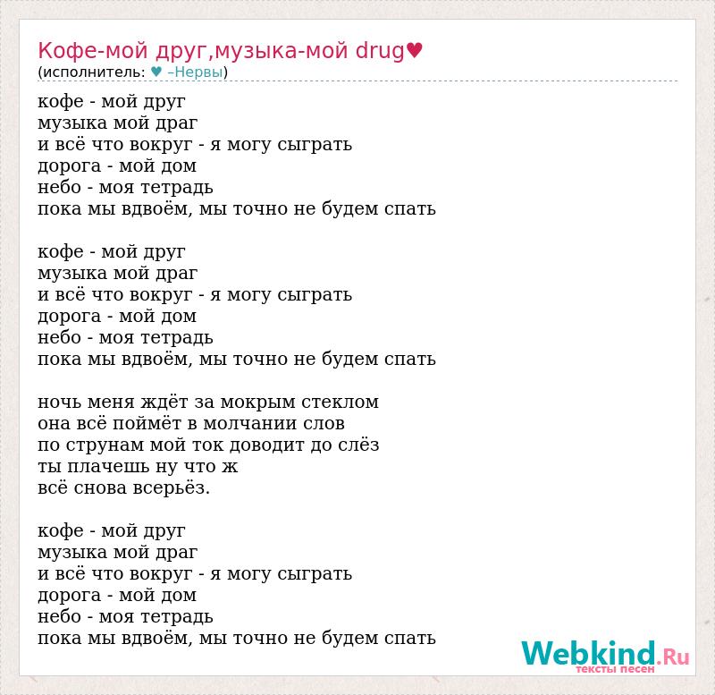 кофе - мой друг музыка мой драг и всё что вокруг - я могу сыграть дорога - мой дом небо - моя тетрадь пока мы вдвоём, мы точно не будем спать кофе - мой друг музыка мой драг и всё что вокруг - я могу сыграть дорога - мой дом небо - моя тетрадь пока мы вдвоём, мы точно не будем спать ночь меня ждёт за мокрым стеклом она всё поймёт в молчании слов по струнам мой ток доводит до слёз ты плачешь ну что ж всё снова всерьёз. кофе - мой друг музыка мой драг и всё что вокруг - я могу сыграть дорога - мой дом небо - моя тетрадь пока мы вдвоём, мы точно не будем спать