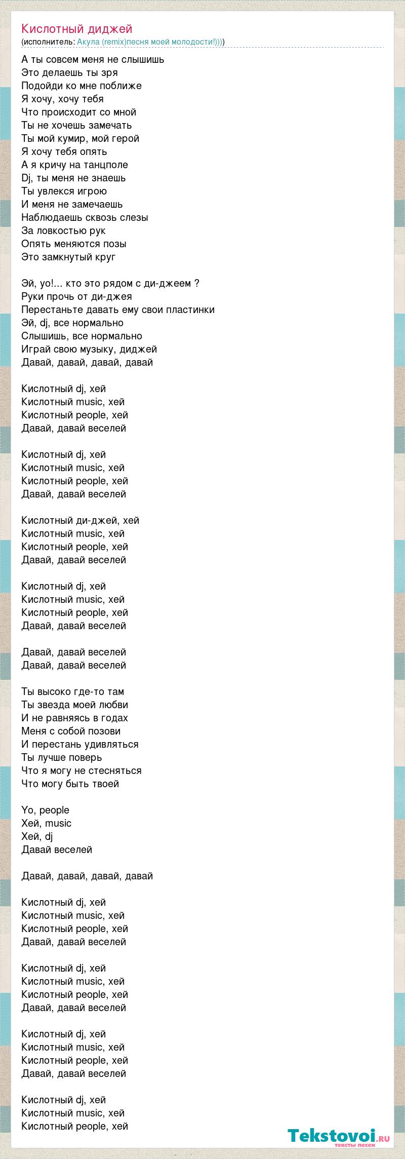 А ты совсем меня не слышишь Это делаешь ты зря Подойди ко мне поближе Я хочу, хочу тебя Что происходит со мной Ты не хочешь замечать Ты мой кумир, мой герой Я хочу тебя опять А я кричу на танцполе Dj, ты меня не знаешь Ты увлекся игрою И меня не замечаешь Наблюдаешь сквозь слезы За ловкостью рук Опять меняются позы Это замкнутый круг Эй, yo!... кто это рядом с ди-джеем ? Руки прочь от ди-джея Перестаньте давать ему свои пластинки Эй, dj, все нормально Слышишь, все нормально Играй свою музыку, диджей Давай, давай, давай, давай Кислотный dj, хей Кислотный music, хей Кислотный people, хей Давай, давай веселей Кислотный dj, хей Кислотный music, хей Кислотный people, хей Давай, давай веселей Кислотный ди-джей, хей Кислотный music, хей Кислотный people, хей Давай, давай веселей Кислотный dj, хей Кислотный music, хей Кислотный people, хей Давай, давай веселей Давай, давай веселей Давай, давай веселей Ты высоко где-то там Ты звезда моей любви И не равняясь в годах Меня с собой позови И перестань удивляться Ты лучше поверь Что я могу не стесняться Что могу быть твоей Yo, people Хей, music Хей, dj Давай веселей Давай, давай, давай, давай Кислотный dj, хей Кислотный music, хей Кислотный people, хей Давай, давай веселей Кислотный dj, хей Кислотный music, хей Кислотный people, хей Давай, давай веселей Кислотный dj, хей Кислотный music, хей Кислотный people, хей Давай, давай веселей Кислотный dj, хей Кислотный music, хей Кислотный people, хей