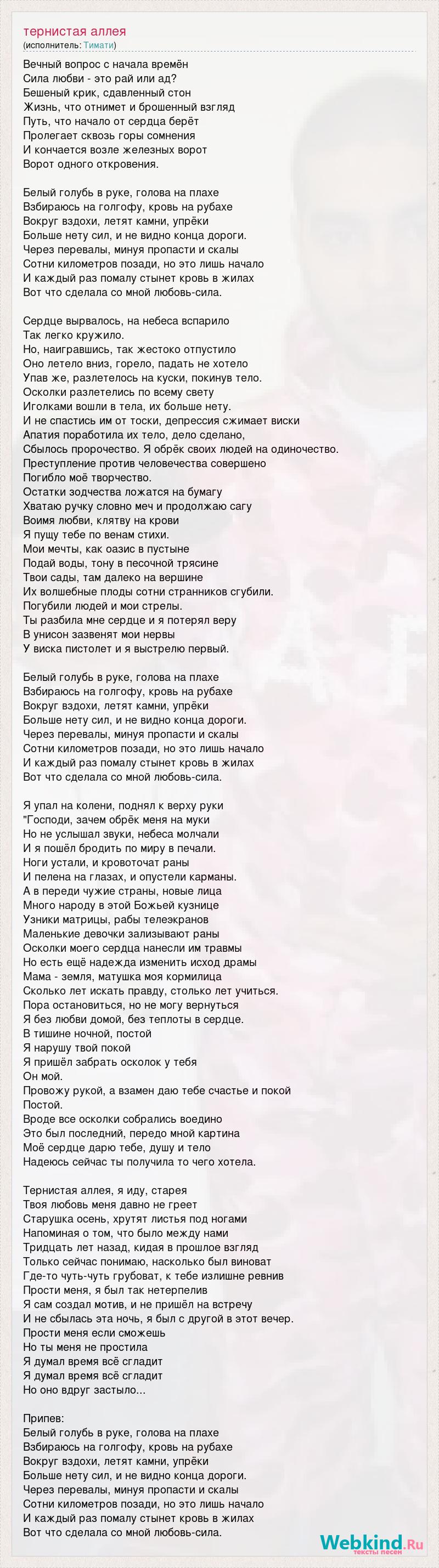 Вечный вопрос с начала времён Сила любви - это рай или ад? Бешеный крик, сдавленный стон Жизнь, что отнимет и брошенный взгляд Путь, что начало от сердца берёт Пролегает сквозь горы сомнения И кончается возле железных ворот Ворот одного откровения. Белый голубь в руке, голова на плахе Взбираюсь на голгофу, кровь на рубахе Вокруг вздохи, летят камни, упрёки Больше нету сил, и не видно конца дороги. Через перевалы, минуя пропасти и скалы Сотни километров позади, но это лишь начало И каждый раз помалу стынет кровь в жилах Вот что сделала со мной любовь-сила. Сердце вырвалось, на небеса вспарило Так легко кружило. Но, наигравшись, так жестоко отпустило Оно летело вниз, горело, падать не хотело Упав же, разлетелось на куски, покинув тело. Осколки разлетелись по всему свету Иголками вошли в тела, их больше нету. И не спастись им от тоски, депрессия сжимает виски Апатия поработила их тело, дело сделано, Сбылось пророчество. Я обрёк своих людей на одиночество. Преступление против человечества совершено Погибло моё творчество. Остатки зодчества ложатся на бумагу Хватаю ручку словно меч и продолжаю сагу Воимя любви, клятву на крови Я пущу тебе по венам стихи. Мои мечты, как оазис в пустыне Подай воды, тону в песочной трясине Твои сады, там далеко на вершине Их волшебные плоды сотни странников сгубили. Погубили людей и мои стрелы. Ты разбила мне сердце и я потерял веру В унисон зазвенят мои нервы У виска пистолет и я выстрелю первый. Белый голубь в руке, голова на плахе Взбираюсь на голгофу, кровь на рубахе Вокруг вздохи, летят камни, упрёки Больше нету сил, и не видно конца дороги. Через перевалы, минуя пропасти и скалы Сотни километров позади, но это лишь начало И каждый раз помалу стынет кровь в жилах Вот что сделала со мной любовь-сила. Я упал на колени, поднял к верху руки "Господи, зачем обрёк меня на муки Но не услышал звуки, небеса молчали И я пошёл бродить по миру в печали. Ноги устали, и кровоточат раны И пелена на глазах, и опустели карманы. А в переди чужие страны, новые лица Много народу в этой Божьей кузнице Узники матрицы, рабы телеэкранов Маленькие девочки зализывают раны Осколки моего сердца нанесли им травмы Но есть ещё надежда изменить исход драмы Мама - земля, матушка моя кормилица Сколько лет искать правду, столько лет учиться. Пора остановиться, но не могу вернуться Я без любви домой, без теплоты в сердце. В тишине ночной, постой Я нарушу твой покой Я пришёл забрать осколок у тебя Он мой. Провожу рукой, а взамен даю тебе счастье и покой Постой. Вроде все осколки собрались воедино Это был последний, передо мной картина Моё сердце дарю тебе, душу и тело Надеюсь сейчас ты получила то чего хотела. Тернистая аллея, я иду, старея Твоя любовь меня давно не греет Старушка осень, хрутят листья под ногами Напоминая о том, что было между нами Тридцать лет назад, кидая в прошлое взгляд Только сейчас понимаю, насколько был виноват Где-то чуть-чуть грубоват, к тебе излишне ревнив Прости меня, я был так нетерпелив Я сам создал мотив, и не пришёл на встречу И не сбылась эта ночь, я был с другой в этот вечер. Прости меня если сможешь Но ты меня не простила Я думал время всё сгладит Я думал время всё сгладит Но оно вдруг застыло... Припев: Белый голубь в руке, голова на плахе Взбираюсь на голгофу, кровь на рубахе Вокруг вздохи, летят камни, упрёки Больше нету сил, и не видн