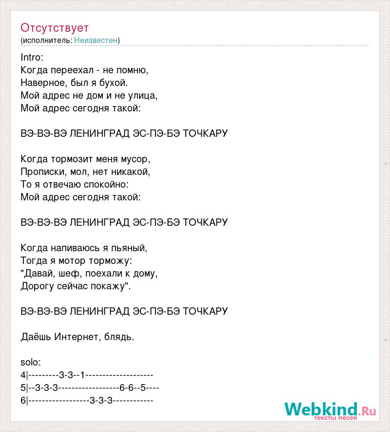 Intro: Когда переехал - не помню, Наверное, был я бухой. Мой адрес не дом и не улица, Мой адрес сегодня такой: ВЭ-ВЭ-ВЭ ЛЕНИНГРАД ЭС-ПЭ-БЭ ТОЧКАРУ Когда тормозит меня мусор, Прописки, мол, нет никакой, То я отвечаю спокойно: Мой адрес сегодня такой: ВЭ-ВЭ-ВЭ ЛЕНИНГРАД ЭС-ПЭ-БЭ ТОЧКАРУ Когда напиваюсь я пьяный, Тогда я мотор торможу: "Давай, шеф, поехали к дому, Дорогу сейчас покажу". ВЭ-ВЭ-ВЭ ЛЕНИНГРАД ЭС-ПЭ-БЭ ТОЧКАРУ Даёшь Интернет, блядь. solo: 4|---------3-3--1-------------------- 5|--3-3-3------------------6-6--5---- 6|------------------3-3-3------------