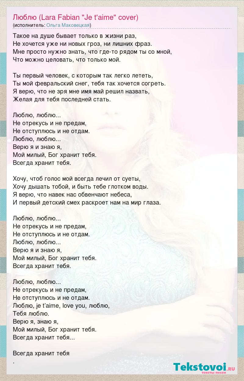 Такое на душе бывает только в жизни раз, Не хочется уже ни новых гроз, ни лишних фраз. Мне просто нужно знать, что где-то рядом ты со мной, Что можно целовать, что только мой. Ты первый человек, с которым так легко лететь, Ты мой февральский снег, тебя так хочется согреть. Я верю, что не зря мне имя май решил назвать, Желая для тебя последней стать. Люблю, люблю... Не отрекусь и не предам, Не отступлюсь и не отдам. Люблю, люблю... Верю я и знаю я, Мой милый, Бог хранит тебя. Всегда хранит тебя. Хочу, чтоб голос мой всегда лечил от суеты, Хочу дышать тобой, и быть тебе глотком воды. Я верю, что навек нас обвенчают небеса, И первый детский смех раскроет нам на мир глаза. Люблю, люблю... Не отрекусь и не предам, Не отступлюсь и не отдам. Люблю, люблю... Верю я и знаю я, Мой милый, Бог хранит тебя. Всегда хранит тебя. Люблю, люблю... Не отрекусь и не предам, Не отступлюсь и не отдам. Люблю, je t’aime, love you, люблю, Тебя люблю. Верю я, знаю я, Мой милый, Бог хранит тебя. Всегда хранит тебя... Всегда хранит тебя .