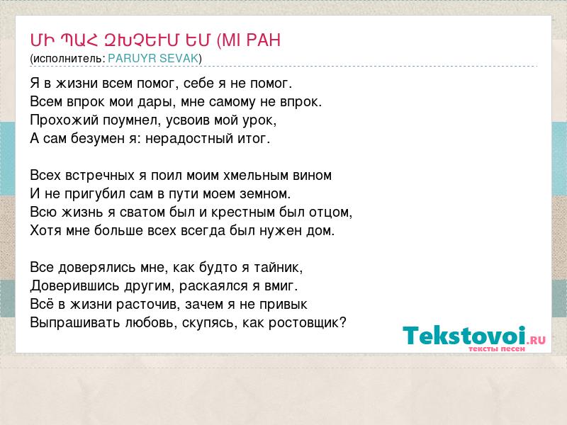 А как ты думаешь, о чем песня "ՄԻ ՊԱՀ ԶԽՉԵՒՄ ԵՄ (MI PAH" ?