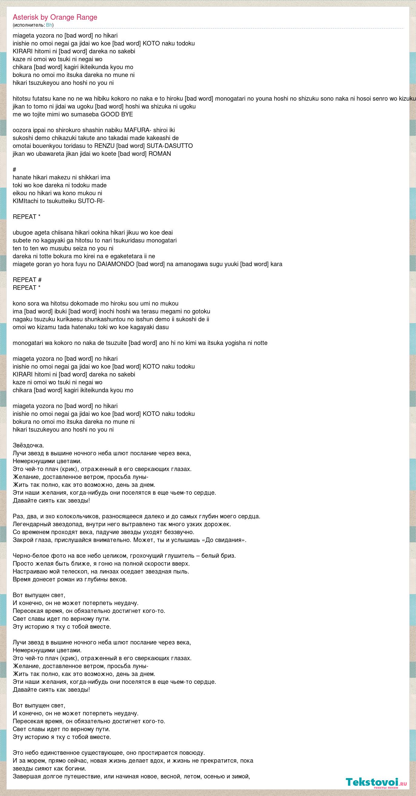 miageta yozora no [bad word] no hikari inishie no omoi negai ga jidai wo koe iroaseru KOTO naku todoku KIRARI hitomi ni utsuru dareka no sakebi kaze ni omoi wo tsuki ni negai wo chikara aru kagiri ikiteikunda kyou mo bokura no omoi mo itsuka dareka no mune ni hikari tsuzukeyou ano hoshi no you ni hitotsu futatsu kane no ne wa hibiku kokoro no naka e to hiroku [bad word] monogatari no youna hoshi no shizuku sono naka ni hosoi senro wo kizuku jikan to tomo ni jidai wa ugoku nagareru hoshi wa shizuka ni ugoku me wo tojite mimi wo sumaseba GOOD BYE oozora ippai no shirokuro shashin nabiku MAFURA- shiroi iki sukoshi demo chikazuki takute ano takadai made kakeashi de omotai bouenkyou toridasu to RENZU [bad word] SUTA-DASUTTO jikan wo ubawareta jikan jidai wo koete kuru ROMAN # hanate hikari makezu ni shikkari ima toki wo koe dareka ni todoku made eikou no hikari wa kono mukou ni KIMItachi to tsukutteiku SUTO-RI- REPEAT * ubugoe ageta chiisana hikari ookina hikari jikuu wo koe deai subete no kagayaki ga hitotsu to nari tsukuridasu monogatari ten to ten wo musubu seiza no you ni dareka ni totte bokura mo kirei na e egaketetara ii ne miagete goran yo hora fuyu no DAIAMONDO yuruyaka na amanogawa sugu yuuki torimodoseru kara REPEAT # REPEAT * kono sora wa hitotsu dokomade mo hiroku sou umi no mukou ima umareru ibuki tatareru inochi hoshi wa terasu megami no gotoku nagaku tsuzuku kurikaesu shunkashuntou no isshun demo ii sukoshi de ii omoi wo kizamu tada hatenaku toki wo koe kagayaki dasu monogatari wa kokoro no naka de tsuzuite iru ano hi no kimi wa itsuka yogisha ni notte miageta yozora no [bad word] no hikari inishie no omoi negai ga jidai wo koe iroaseru KOTO naku todoku KIRARI hitomi ni utsuru dareka no sakebi kaze ni omoi wo tsuki ni negai wo chikara aru kagiri ikiteikunda kyou mo miageta yozora no [bad word] no hikari inishie no omoi negai ga jidai wo koe iroaseru KOTO naku todoku bokura no omoi mo itsuka dareka no mune ni hikari tsuzukeyou ano hoshi no you ni Звёздочка. Лучи звезд в вышине ночного неба шлют послание через века, Немеркнущими цветами. Это чей-то плач (крик), отраженный в его сверкающих глазах. Желание, доставленное ветром, просьба луны- Жить так полно, как это возможно, день за днем. Эти наши желания, когда-нибудь они поселятся в еще чьем-то сердце. Давайте сиять как звезды! Раз, два, и эхо колокольчиков, разносящееся далеко и до самых глубин моего сердца. Легендарный звездопад, внутри него вытравлено так много узких дорожек. Со временем проходят века, падучие звезды уходят беззвучно. Закрой глаза, прислушайся внимательно. Может, ты и услышишь «До свидания». Черно-белое фото на все небо целиком, грохочущий глушитель – белый бриз. Просто желая быть ближе, я гоню на полной скорости вверх. Настраиваю мой телескоп, на линзах оседает звездная пыль. Время донесет роман из глубины веков. Вот выпущен свет, И конечно, он не может потерпеть неудачу. Пересекая время, он обязательно достигнет кого-то. Свет славы идет по верному пути. Эту историю я тку с тобой вместе. Лучи звезд в вышине ночного неба шлют послание через века, Немеркнущими цветами. Это чей-то плач (крик), отраженный в его сверкающих глазах. Желание, доставленное ветром, просьба луны- Жить так полно, как это возможно, день за днем. Эти наши желания, когда-нибудь они поселятся в еще чьем-то сердце. Давайте сиять как звезды! Вот выпущен свет, И конечно, он не может потерпеть неудачу. Пересекая время, он обязательно достигнет кого-то. Свет славы идет по верному пути. Эту историю я тку с тобой вместе. Это небо единственное существующее, оно простирается повсюду. И за морем, прямо сейчас, новая жизнь делает вдох, и жизнь не прекратится, пока звезды сияют как богини. Завершая долгое путешествие, или начиная новое, весной, летом, осенью и зимой,