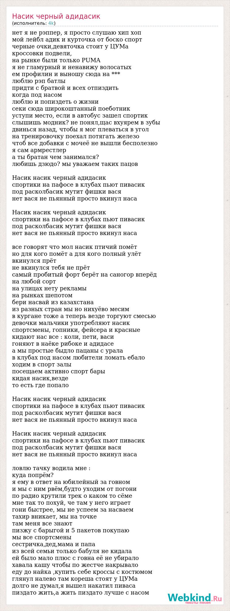 нет я не рэппер, я просто слушаю хип хоп мой лейбл адик и курточка от боско спорт черные очки,девяточка стоит у ЦУМа кроссовки подвели, на рынке были только PUMA я не гламурный и ненавижу волосатых ем профилин и выношу сюда на *** люблю рэп батлы придти с братвой и всех отпиздить когда под насом люблю и попиздеть о жизни секи сюда широкоштанный поеботник уступи место, если в автобус зашел спортик слышишь модник? не понял,щас вхуярем в зубы двинься назад, чтобы я мог плеваться в угол на тренировочку поехал потягать железо чтоб все добавки с мочеё не вышли бесполезно я сам армрестлер а ты братан чем занимался? любишь дзюдо? мы уважаем таких пацов Насик насик черный адидасик спортики на пафосе в клубах пьют пивасик под расколбасик мутит фишки вася нет вася не пьянный просто вкинул наса Насик насик черный адидасик спортики на пафосе в клубах пьют пивасик под расколбасик мутит фишки вася нет вася не пьянный просто вкинул наса все говорят что мол насик птичий помёт но для кого помёт а для кого полный улёт вкинулся прёт не вкинулся тебя не прёт самый пробитый форт берёт на саногор вперёд на любой сорт на улицах нету рекламы на рынках шепотом бери насвай из казахстана из разных стран мы но нихуёво месим в кургане тоже а теперь везде торгуют смесью девочки мальчики употребляют насик спортсмены, гопники, фейсера и красные кидают нас все : коли, пети, васи гоняют в наёке рибоке и адидасе а мы простые быдло пацаны с урала в клубах под насом любители ломать ебало ходим в спорт залы посещаем активно спорт бары кидая насик,везде то есть где попало Насик насик черный адидасик спортики на пафосе в клубах пьют пивасик под расколбасик мутит фишки вася нет вася не пьянный просто вкинул наса Насик насик черный адидасик спортики на пафосе в клубах пьют пивасик под расколбасик мутит фишки вася нет вася не пьянный просто вкинул наса ловлю тачку водила мне : куда попрём? я ему в ответ на юбилейный за говном и мы с ним рвём,будто уходим от погони по радио крутили трек о каком то сёме мне так то похуй, че там у него играет гони быстрее, мы не успеем за насваем тахир вникает, мы на точке там меня все знают пизжу с барыгой и 5 пакетов покупаю мы все спортсмены сестричка,дед,мама и папа из всей семьи только бабуля не кидала ей было мало плюс с говна её не убирало хавала кашу чтобы по жестче накрывало еду до найка ,купить себе кроссы с костюмом глянул налево там кореша стоят у ЦУМа долго не думал,я вышел накатил пиваса пиздато жить,а жить пиздато лучше с насом