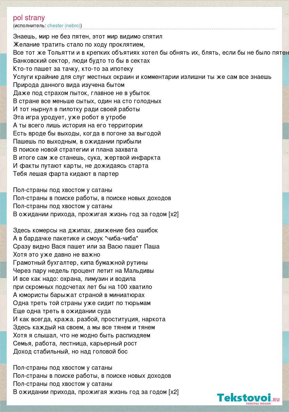 Знаешь, мир не без пятен, этот мир видимо спятил Желание тратить стало по ходу проклятием, Все тот же Тольятти и в крепких объятиях хотел бы обнять их, блять, если бы не было пятен Банковский сектор, люди будто то бы в сектах Кто-то пашет за тачку, кто-то за ипотеку Услуги крайние для слуг местных окраин и комментарии излишни ты же сам все знаешь Природа данного вида изучена бытом Даже под страхом пыток, главное не в убыток В стране все меньше сытых, один на сто голодных И тот нырнул в пилотку ради своей работы Эта игра уродует, уже робот в утробе А ты всего лишь история на его территории Есть вроде бы выходы, когда в погоне за выгодой Пашешь по выходным, в ожидании прибыли В поиске новой стратегии и плана захвата В итоге сам же станешь, сука, жертвой инфаркта И факты путают карты, не дожидаясь старта Тебя лешая фарта кидают в партер Пол-страны под хвостом у сатаны Пол-страны в поиске работы, в поиске новых доходов Пол-страны под хвостом у сатаны В ожидании прихода, прожигая жизнь год за годом [x2] Здесь комерсы на джипах, движение без ошибок А в бардачке пакетике и смоук "чиба-чиба" Сразу видно Вася пашет или за Васю пашет Паша Хотя это уже давно не важно Грамотный бухгалтер, кипа бумажной рутины Через пару недель процент летит на Мальдивы И все как надо: охрана, лимузин и водила при скромных подсчетах лет бы на 100 хватило А юмористы барыжат страной в миниатюрах Одна треть той страны уже сидит по тюрьмам Еще одна треть в ожидании суда И как всегда, кража. разбой, проституция, наркота Здесь каждый на своем, а мы все тянем и тянем Хотя я слышал, что не модно быть распиздяем Семья, работа, лестница, карьерный рост Доход стабильный, но над головой бос Пол-страны под хвостом у сатаны Пол-страны в поиске работы, в поиске новых доходов Пол-страны под хвостом у сатаны В ожидании прихода, прожигая жизнь год за годом [x2]