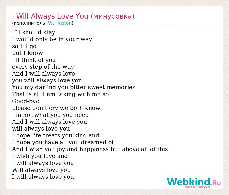 If I should stay I would only be in your way so I'll go but I know I'll think of you every step of the way And I will always love you will always love you You my darling you bitter sweet memories That is all I am taking with me so Good-bye please don't cry we both know I'm not what you you need And I will always love you will always love you I hope life treats you kind and I hope you have all you dreamed of And I wish you joy and happiness but above all of this I wish you love and I will always love you Will always love you I will always love you