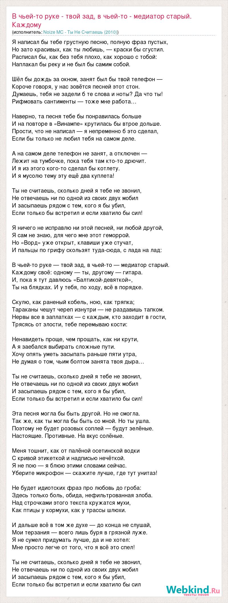 Я написал бы тебе грустную песню, полную фраз пустых, Но зато красивых, как ты любишь, — краски бы сгустил. Расписал бы, как без тебя плохо, как хорошо с тобой: Наплакал бы реку и не был бы самим собой. Шёл бы дождь за окном, занят был бы твой телефон — Короче говоря, у нас зовётся песней этот стон. Думаешь, тебя не задели б те слова и ноты? Да что ты! Рифмовать сантименты — тоже мне работа… Наверно, та песня тебе бы понравилась больше И на повторе в «Винампе» крутилась бы втрое дольше. Прости, что не написал — я непременно б это сделал, Если бы только не любил тебя на самом деле. А на самом деле телефон не занят, а отключен — Лежит на тумбочке, пока тебя там кто-то дрючит. И я из этого кого-то сделал бы котлету. И я мусолю тему эту ещё два куплета! Ты не считаешь, сколько дней я тебе не звонил, Не отвечаешь ни по одной из своих двух мобил И засыпаешь рядом с тем, кого я бы убил, Если только бы встретил и если хватило бы сил! Я ничего не исправлю ни этой песней, ни любой другой, Я сам не знаю, для чего мне этот геморрой. Но «Ворд» уже открыт, клавиши уже стучат, И пальцы по грифу скользят туда-сюда, с лада на лад: В чьей-то руке — твой зад, в чьей-то — медиатор старый. Каждому своё: одному — ты, другому — гитара. И, пока я тут давлюсь «Балтикой-девяткой», Ты на блядках. И у тебя, по ходу, всё в порядке. Скулю, как раненый кобель, ною, как тряпка; Тараканы чешут череп изнутри — не раздавишь тапком. Нервы все в заплатках — с каждым, кто заходит в гости, Трясясь от злости, тебе перемываю кости: Ненавидеть проще, чем прощать, как ни крути, А я заебался выбирать сложные пути. Хочу опять уметь засыпать раньше пяти утра, Не думая о том, чьим болтом занята твоя дыра… Ты не считаешь, сколько дней я тебе не звонил, Не отвечаешь ни по одной из своих двух мобил И засыпаешь рядом с тем, кого я бы убил, Если только бы встретил и если хватило бы сил! Эта песня могла бы быть другой. Но не смогла. Так же, как ты могла бы быть со мной. Но ты ушла. Поэтому не будет розовых соплей — будут зелёные. Настоящие. Противные. На вкус солёные. Меня тошнит, как от палёной осетинской водки С кривой этикеткой и надписью нечёткой. Я не пою — я блюю этими словами сейчас. Уберите микрофон — скажите лучше, где тут унитаз! Не будет идиотских фраз про любовь до гроба: Здесь только боль, обида, нефильтрованная злоба. Над строчками этого текста кружатся мухи, Как птицы у кормухи, как у трассы шлюхи. И дальше всё в том же духе — до конца не слушай, Мои терзания — всего лишь буря в грязной луже. Я не сумел придумать лучше, да и не хотел: Мне просто легче от того, что я всё это спел! Ты не считаешь, сколько дней я тебе не звонил, Не отвечаешь ни по одной из своих двух мобил И засыпаешь рядом с тем, кого я бы убил, Если только бы встретил и если хватило бы сил