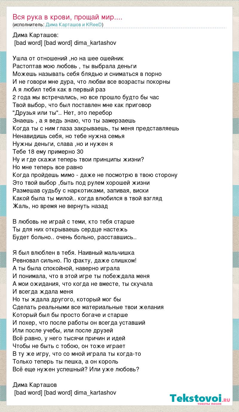 Дима Карташов: [bad word] [bad word] dima_kartashov Ушла от отношений ,но на шее ошейник Растоптав мою любовь , ты выбрала деньги Можешь называть себя блядью и сниматься в порно И не говори мне дура, что любви все возрасты покорны А я любил тебя как в первый раз 2 года мы встречались, но все прошло будто бы час Твой выбор, что был поставлен мне как приговор "Друзья или ты".. Нет, это перебор Знаешь , а я ведь знаю, что ты замерзаешь Когда ты с ним глаза закрываешь, ты меня представляешь Ненавидишь себя, но тебе нужна семья Нужны деньги, слава ,но и нужен я Тебе 18 ему примерно 30 Ну и где скажи теперь твои принципы жизни? Но мне теперь все равно Когда пройдешь мимо - даже не посмотрю в твою сторону Это твой выбор ,быть под рулем хорошей жизни Размешав судьбу с наркотиками, запивая, виски Какой была ты милой.. когда влюбился в твой взгляд Жаль, но время не вернуть назад В любовь не играй с теми, кто тебя старше Ты для них открываешь сердце настежь Будет больно.. очень больно, расставшись.. Я был влюблен в тебя. Наивный мальчишка Ревновал сильно. По факту, даже слишком! А ты была спокойной, наверно играла И понимала, что в этой игре ты побеждала меня А мои ожидания, что когда не вместе, ты скучала И всегда ждала меня Но ты ждала другого, который мог бы Сделать реальными все материальные твои желания Который был бы просто богаче и старше И похер, что после работы он всегда уставший Или после учебы, или после друзей Всё равно, у него тысячи причин и идей Чтобы не быть с тобою, он тоже играет В ту же игру, что со мной играла ты когда-то Только теперь ты пешка, а он король Всё еще нужен успешный? Или уже любовь? Дима Карташов [bad word] [bad word] dima_kartashov