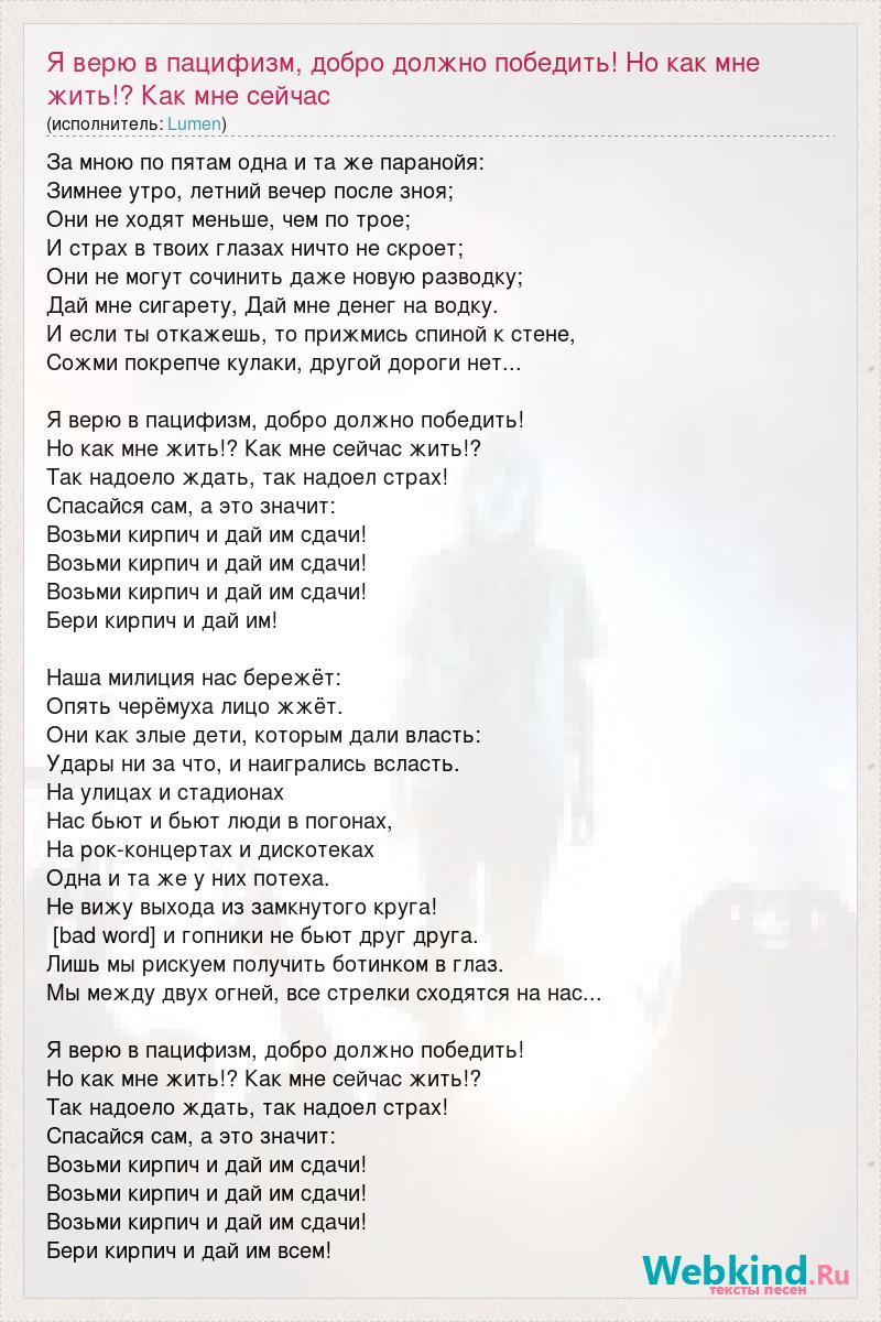 За мною по пятам одна и та же паранойя: Зимнее утро, летний вечер после зноя; Они не ходят меньше, чем по трое; И страх в твоих глазах ничто не скроет; Они не могут сочинить даже новую разводку; Дай мне сигарету, Дай мне денег на водку. И если ты откажешь, то прижмись спиной к стене, Сожми покрепче кулаки, другой дороги нет... Я верю в пацифизм, добро должно победить! Но как мне жить!? Как мне сейчас жить!? Так надоело ждать, так надоел страх! Спасайся сам, а это значит: Возьми кирпич и дай им сдачи! Возьми кирпич и дай им сдачи! Возьми кирпич и дай им сдачи! Бери кирпич и дай им! Наша милиция нас бережёт: Опять черёмуха лицо жжёт. Они как злые дети, которым дали власть: Удары ни за что, и наигрались всласть. На улицах и стадионах Нас бьют и бьют люди в погонах, На рок-концертах и дискотеках Одна и та же у них потеха. Не вижу выхода из замкнутого круга! [bad word] и гопники не бьют друг друга. Лишь мы рискуем получить ботинком в глаз. Мы между двух огней, все стрелки сходятся на нас... Я верю в пацифизм, добро должно победить! Но как мне жить!? Как мне сейчас жить!? Так надоело ждать, так надоел страх! Спасайся сам, а это значит: Возьми кирпич и дай им сдачи! Возьми кирпич и дай им сдачи! Возьми кирпич и дай им сдачи! Бери кирпич и дай им всем!