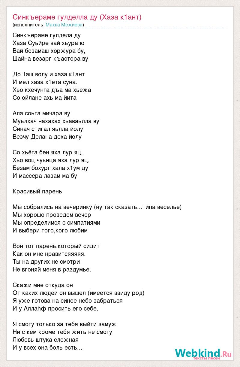 Синкъераме гулдела ду Хаза Суьйре вай хьура ю Вай безамаш хоржура бу, Шайна везарг къастора ву До 1аш волу и хаза к1ант И мел хаза х1ета суна. Хьо кхечунга дъа ма хьежа Со ойлане ахь ма йита Ала соьга мичара ву Муьлхач нахахах хьаваьлла ву Синач стигал яьлла йолу Везчу Делана деха йолу Со хьёга бен яха лур яц, Хьо воц чуьнца яха лур яц, Безам бохург хала х1ум ду И массера лазам ма бу Красивый парень Мы собрались на вечеринку (ну так сказать...типа веселье) Мы хорошо проведем вечер Мы определимся с симпатиями И выбери того,кого любим Вон тот парень,который сидит Как он мне нравитсяяяяя. Ты на других не смотри Не вгоняй меня в раздумье. Скажи мне откуда он От каких людей он вышел (имеется ввиду род) Я уже готова на синее небо забраться И у Аллаhф просить его себе. Я смогу только за тебя выйти замуж Ни с кем кроме тебя жить не смогу Любовь штука сложная И у всех она боль есть...