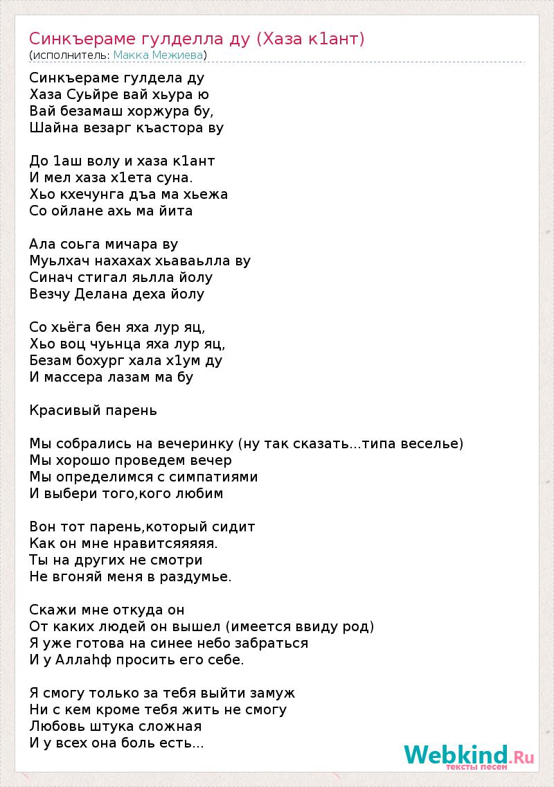 Синкъераме гулдела ду Хаза Суьйре вай хьура ю Вай безамаш хоржура бу, Шайна везарг къастора ву До 1аш волу и хаза к1ант И мел хаза х1ета суна. Хьо кхечунга дъа ма хьежа Со ойлане ахь ма йита Ала соьга мичара ву Муьлхач нахахах хьаваьлла ву Синач стигал яьлла йолу Везчу Делана деха йолу Со хьёга бен яха лур яц, Хьо воц чуьнца яха лур яц, Безам бохург хала х1ум ду И массера лазам ма бу Красивый парень Мы собрались на вечеринку (ну так сказать...типа веселье) Мы хорошо проведем вечер Мы определимся с симпатиями И выбери того,кого любим Вон тот парень,который сидит Как он мне нравитсяяяяя. Ты на других не смотри Не вгоняй меня в раздумье. Скажи мне откуда он От каких людей он вышел (имеется ввиду род) Я уже готова на синее небо забраться И у Аллаhф просить его себе. Я смогу только за тебя выйти замуж Ни с кем кроме тебя жить не смогу Любовь штука сложная И у всех она боль есть...