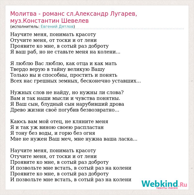 А как ты думаешь, о чем песня "Молитва - романс сл.Александр Лугарев, муз.Константин Шевелев" ?