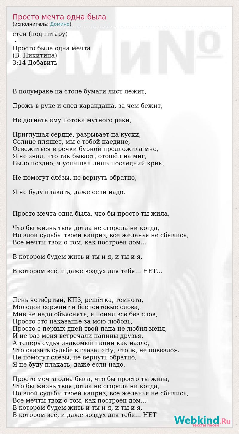 стен (под гитару) - Просто была одна мечта (В. Никитина) 3:14 Добавить В полумраке на столе бумаги лист лежит, Дрожь в руке и след карандаша, за чем бежит, Не догнать ему потока мутного реки, Приглушая сердце, разрывает на куски, Солнце пляшет, мы с тобой наедине, Освежиться в речки бурной предложила мне, Я не знал, что так бывает, отошёл на миг, Было поздно, я услышал лишь последний крик, Не помогут слёзы, не вернуть обратно, Я не буду плакать, даже если надо. Просто мечта одна была, что бы просто ты жила, Что бы жизнь твоя дотла не сгорела ни когда, Но злой судьбы твоей каприз, все желанья не сбылись, Все мечты твои о том, как построен дом… В котором будем жить и ты и я, и ты и я, В котором всё, и даже воздух для тебя… НЕТ… День четвёртый, КПЗ, решётка, темнота, Молодой сержант и беспонтовые слова, Мне не надо объяснять, я понял всё без слов, Просто это наказанье за мою любовь, Просто с первых дней твой папа не любил меня, И не раз меня встречали папины друзья, А теперь судья знакомый папин как назло, Что сказать судьбе в глаза: «Ну, что ж, не повезло». Не помогут слёзы, не вернуть обратно, Я не буду плакать, даже если надо. Просто мечта одна была, что бы просто ты жила, Что бы жизнь твоя дотла не сгорела ни когда, Но злой судьбы твоей каприз, все желанья не сбылись, Все мечты твои о том, как построен дом… В котором будем жить и ты и я, и ты и я, В котором всё, и даже воздух для тебя… НЕТ