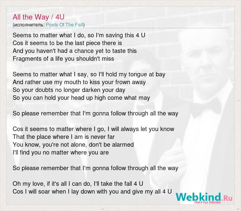 Seems to matter what I do, so I'm saving this 4 U Cos it seems to be the last piece there is And you haven't had a chance yet to taste this Fragments of a life you shouldn't miss Seems to matter what I say, so I'll hold my tongue at bay And rather use my mouth to kiss your frown away So your doubts no longer darken your day So you can hold your head up high come what may So please remember that I'm gonna follow through all the way Cos it seems to matter where I go, I will always let you know That the place where I am is never far You know, you're not alone, don't be alarmed I'll find you no matter where you are So please remember that I'm gonna follow through all the way Oh my love, if it's all I can do, I'll take the fall 4 U Cos I will soar when I lay down with you and give my all 4 U